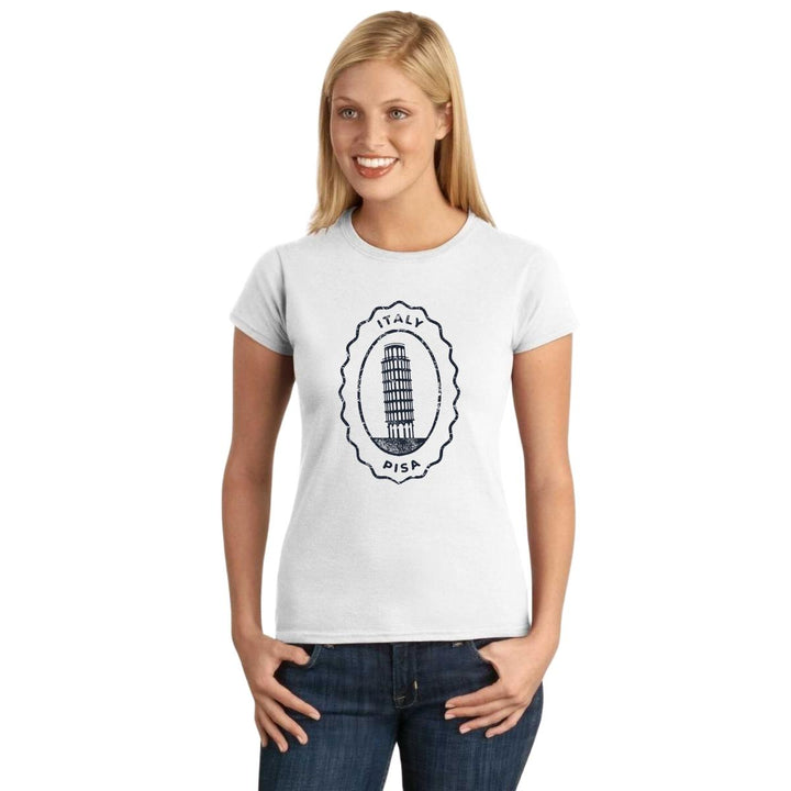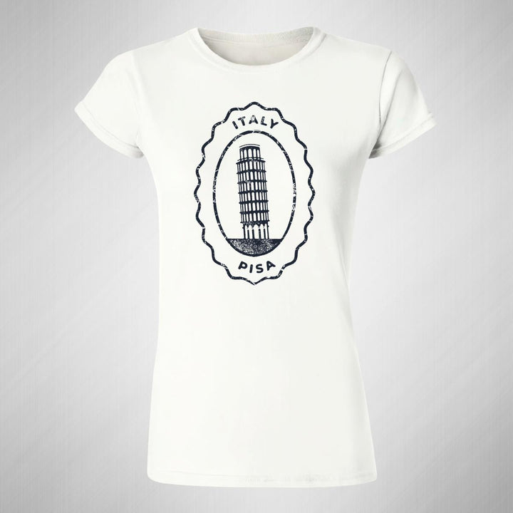 Playera de adulto manga corta, cuello redondo para mujer nueva, diseño Ciudad Pisa Italia original impreso con tecnología DTG (directo a la prenda) tacto cero, uso casual o deportiva, 100% algodón peinado, ajuste semi entallado con costuras laterales. Colores de camiseta para dama: Blanco.