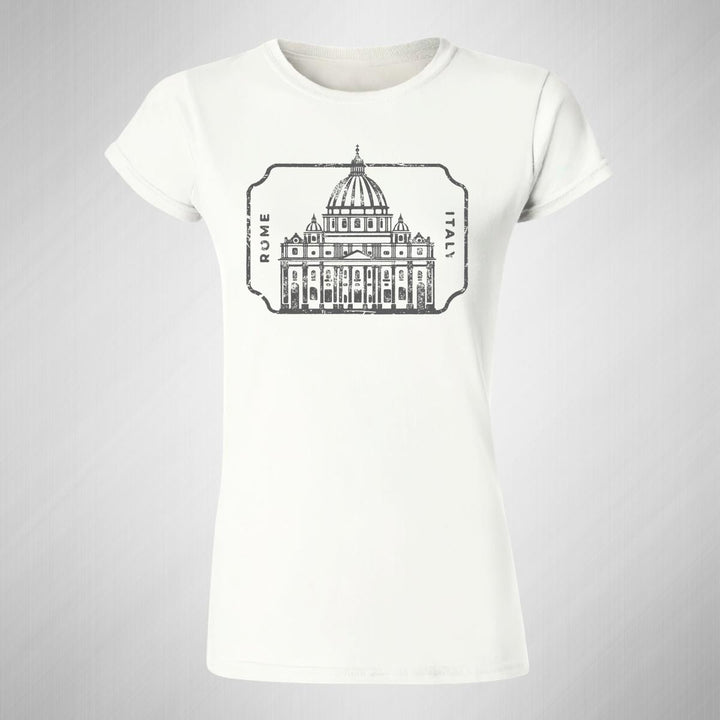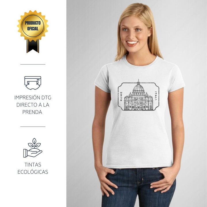 Playera de adulto manga corta, cuello redondo para mujer nueva, diseño Ciudad Roma Italia original impreso con tecnología DTG (directo a la prenda) tacto cero, uso casual o deportiva, 100% algodón peinado, ajuste semi entallado con costuras laterales. Colores de camiseta para dama: Blanco.