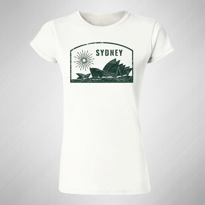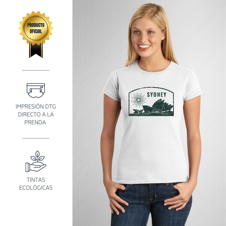 Playera de adulto manga corta, cuello redondo para mujer nueva, diseño Ciudad Sídney Australia original impreso con tecnología DTG (directo a la prenda) tacto cero, uso casual o deportiva, 100% algodón peinado, ajuste semi entallado con costuras laterales. Colores de camiseta para dama: Blanco.