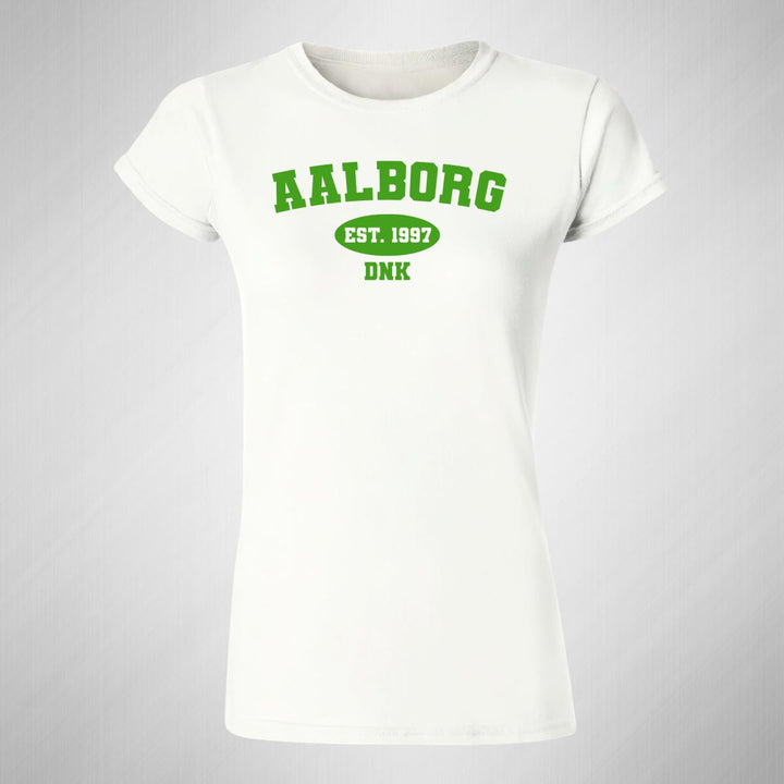 Playera de adulto manga corta, cuello redondo para mujer nueva, diseño Ciudades Aalborg Dinamarca original impreso con tecnología DTG (directo a la prenda) tacto cero, uso casual o deportiva, 100% algodón peinado, ajuste semi entallado con costuras laterales. Colores de camiseta para dama: Blanco.
