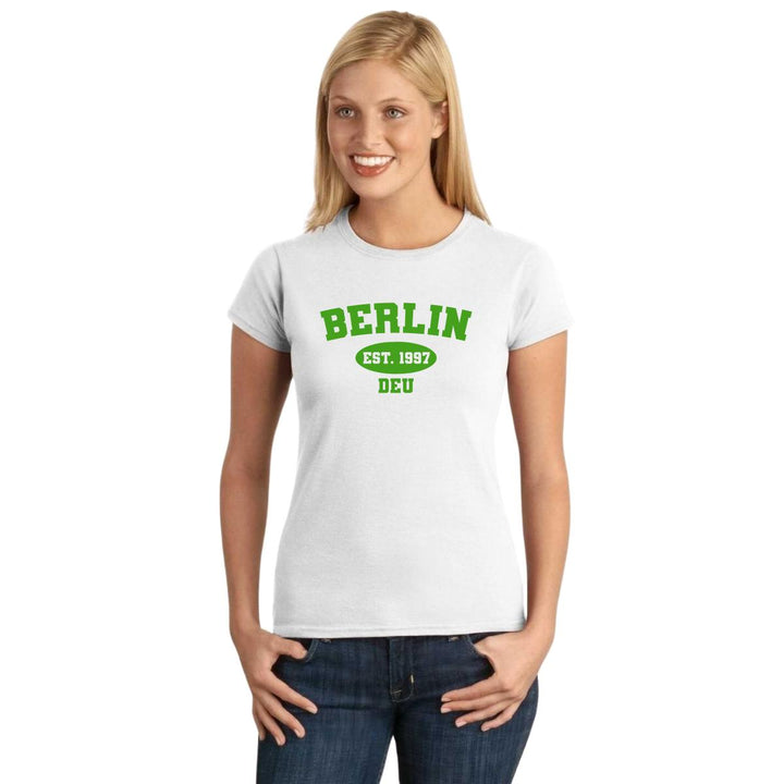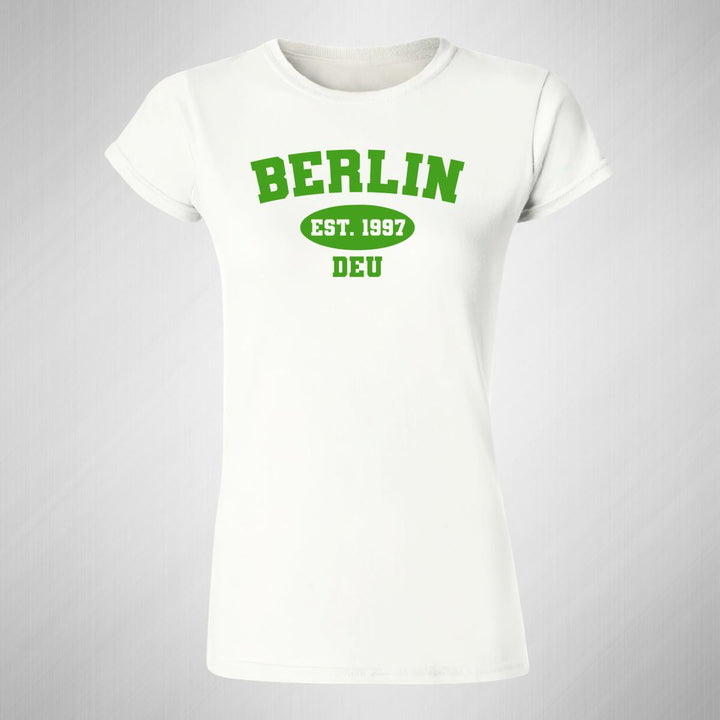 Playera de adulto manga corta, cuello redondo para mujer nueva, diseño Ciudades Berlin Alemania original impreso con tecnología DTG (directo a la prenda) tacto cero, uso casual o deportiva, 100% algodón peinado, ajuste semi entallado con costuras laterales. Colores de camiseta para dama: Blanco.