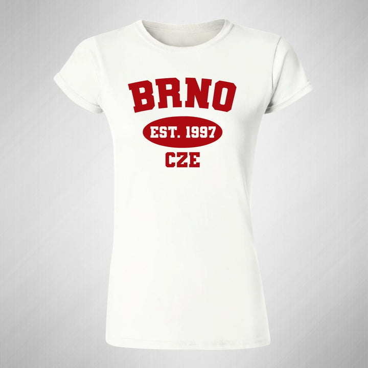 Playera de adulto manga corta, cuello redondo para mujer nueva, diseño Ciudades Brno República Checa original impreso con tecnología DTG (directo a la prenda) tacto cero, uso casual o deportiva, 100% algodón peinado, ajuste semi entallado con costuras laterales. Colores de camiseta para dama: Blanco.
