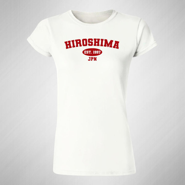 Playera de adulto manga corta, cuello redondo para mujer nueva, diseño Ciudades Hiroshima Japón original impreso con tecnología DTG (directo a la prenda) tacto cero, uso casual o deportiva, 100% algodón peinado, ajuste semi entallado con costuras laterales. Colores de camiseta para dama: Blanco.