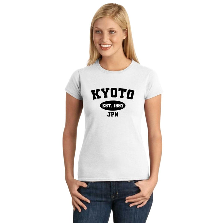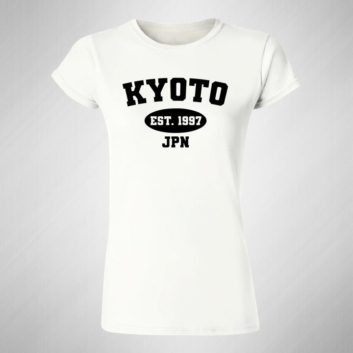 Playera de adulto manga corta, cuello redondo para mujer nueva, diseño Ciudades Kyoto Japón original impreso con tecnología DTG (directo a la prenda) tacto cero, uso casual o deportiva, 100% algodón peinado, ajuste semi entallado con costuras laterales. Colores de camiseta para dama: Blanco.