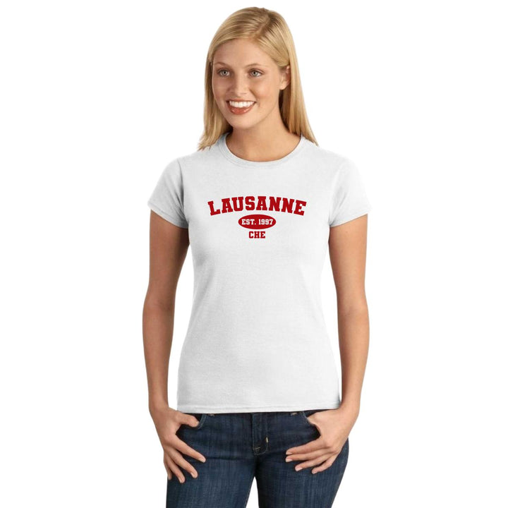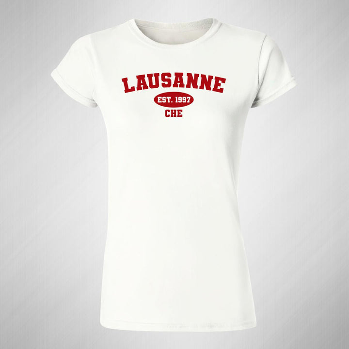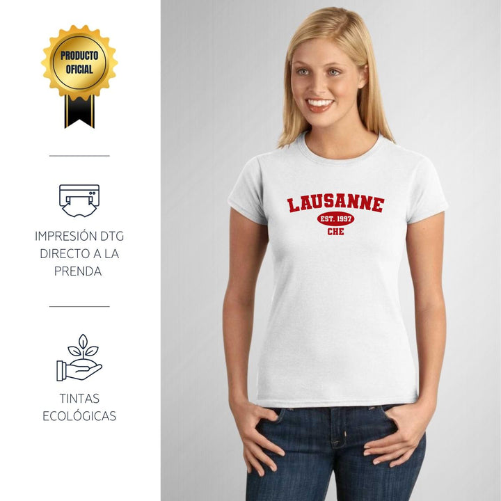 Playera de adulto manga corta, cuello redondo para mujer nueva, diseño Ciudades Lausanne Suiza original impreso con tecnología DTG (directo a la prenda) tacto cero, uso casual o deportiva, 100% algodón peinado, ajuste semi entallado con costuras laterales. Colores de camiseta para dama: Blanco.