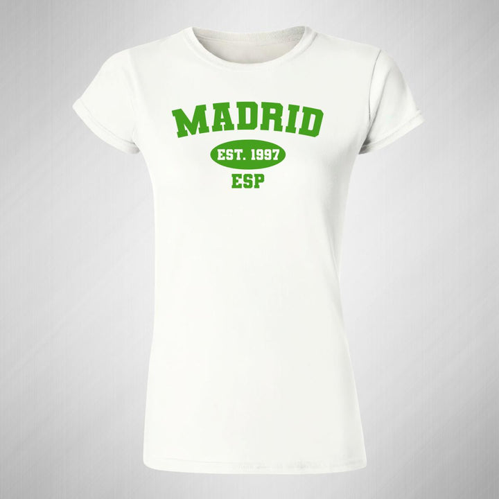 Playera de adulto manga corta, cuello redondo para mujer nueva, diseño Ciudades Madrid España original impreso con tecnología DTG (directo a la prenda) tacto cero, uso casual o deportiva, 100% algodón peinado, ajuste semi entallado con costuras laterales. Colores de camiseta para dama: Blanco.