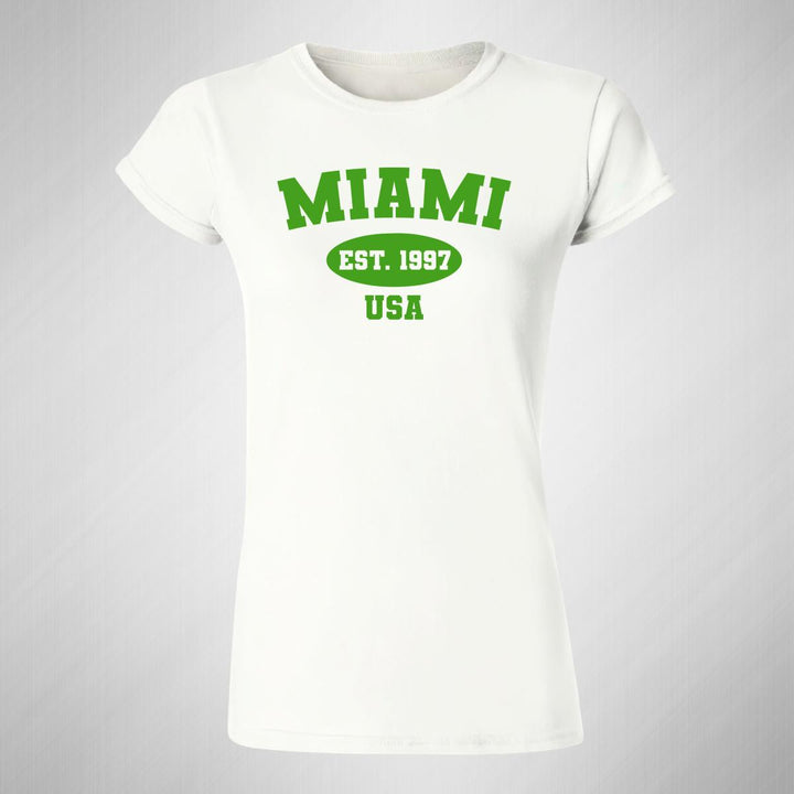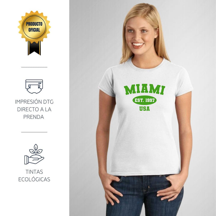 Playera de adulto manga corta, cuello redondo para mujer nueva, diseño Ciudades Miami Estados Unidos original impreso con tecnología DTG (directo a la prenda) tacto cero, uso casual o deportiva, 100% algodón peinado, ajuste semi entallado con costuras laterales. Colores de camiseta para dama: Blanco.