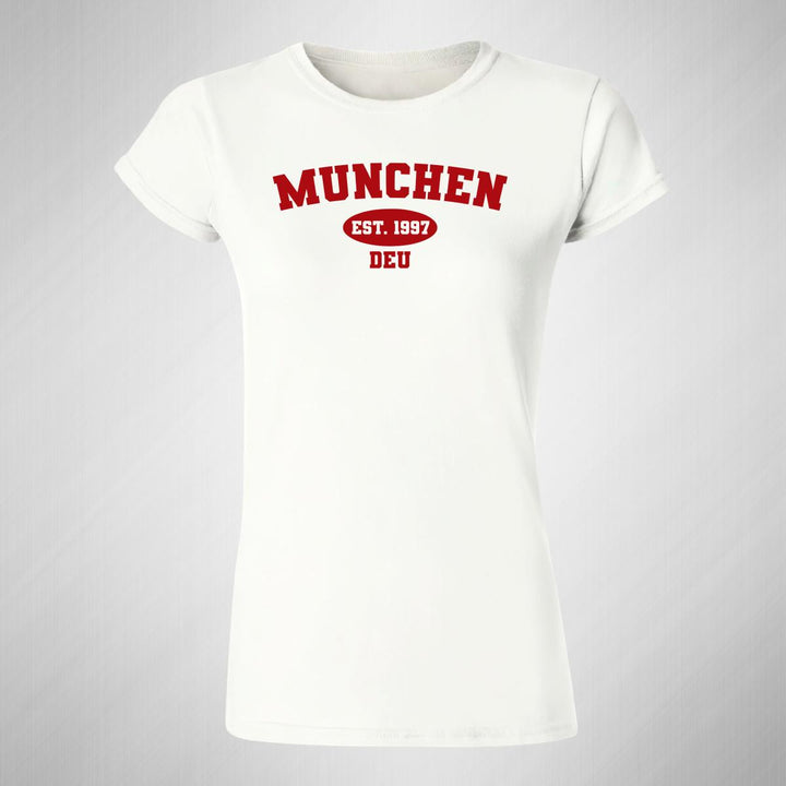 Playera de adulto manga corta, cuello redondo para mujer nueva, diseño Ciudades Munchen Alemania original impreso con tecnología DTG (directo a la prenda) tacto cero, uso casual o deportiva, 100% algodón peinado, ajuste semi entallado con costuras laterales. Colores de camiseta para dama: Blanco.