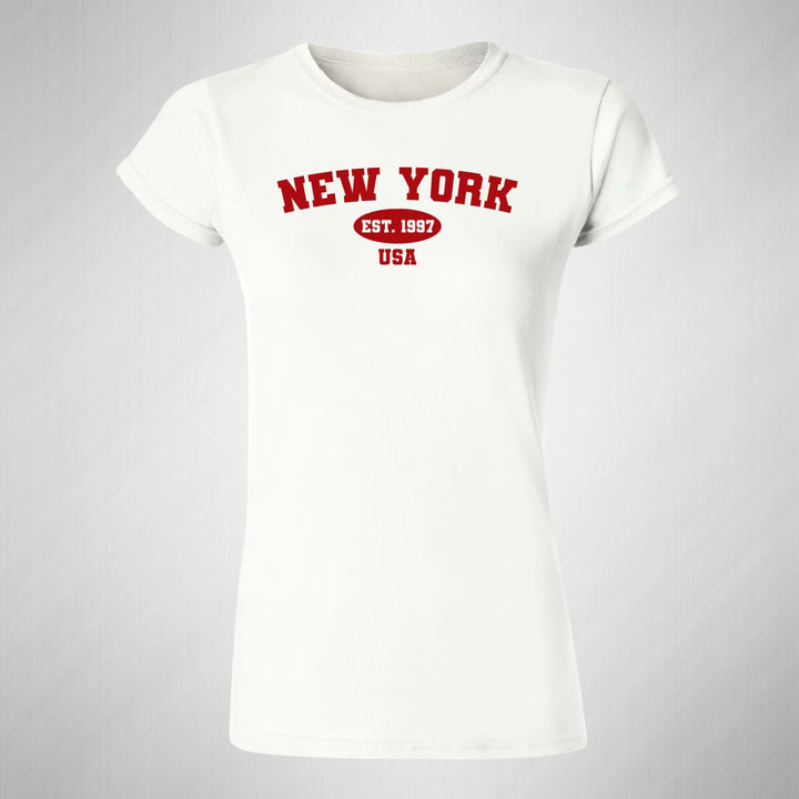 Playera de adulto manga corta, cuello redondo para mujer nueva, diseño Ciudades New York Estados Unidos original impreso con tecnología DTG (directo a la prenda) tacto cero, uso casual o deportiva, 100% algodón peinado, ajuste semi entallado con costuras laterales. Colores de camiseta para dama: Blanco.