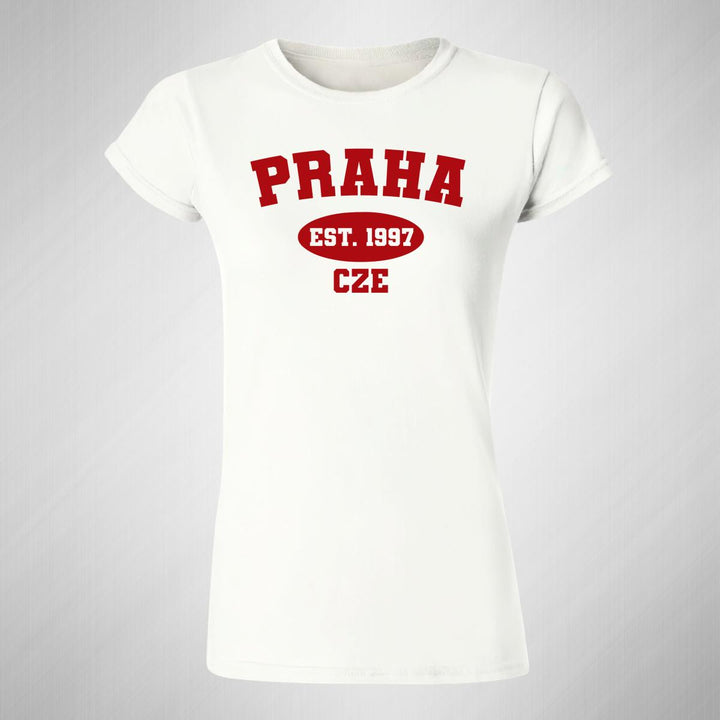 Playera de adulto manga corta, cuello redondo para mujer nueva, diseño Ciudades Praha República Checa original impreso con tecnología DTG (directo a la prenda) tacto cero, uso casual o deportiva, 100% algodón peinado, ajuste semi entallado con costuras laterales. Colores de camiseta para dama: Blanco.