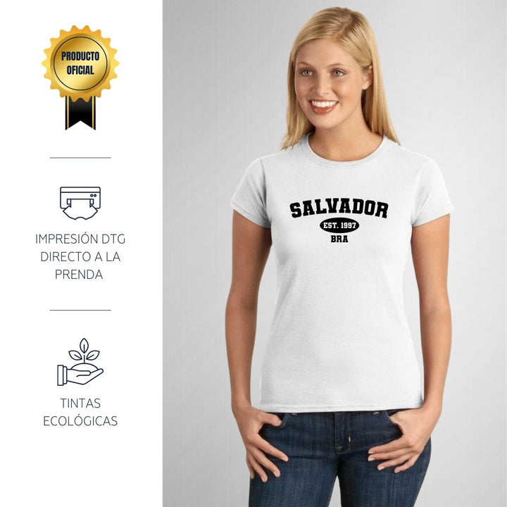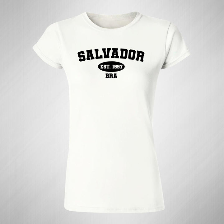 Playera de adulto manga corta, cuello redondo para mujer nueva, diseño Ciudades Salvador Brasil original impreso con tecnología DTG (directo a la prenda) tacto cero, uso casual o deportiva, 100% algodón peinado, ajuste semi entallado con costuras laterales. Colores de camiseta para dama: Blanco.