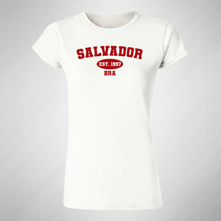 Playera de adulto manga corta, cuello redondo para mujer nueva, diseño Ciudades Salvador Brasil original impreso con tecnología DTG (directo a la prenda) tacto cero, uso casual o deportiva, 100% algodón peinado, ajuste semi entallado con costuras laterales. Colores de camiseta para dama: Blanco.