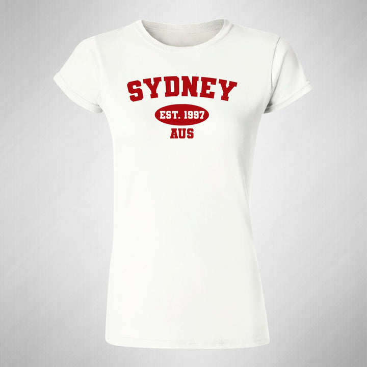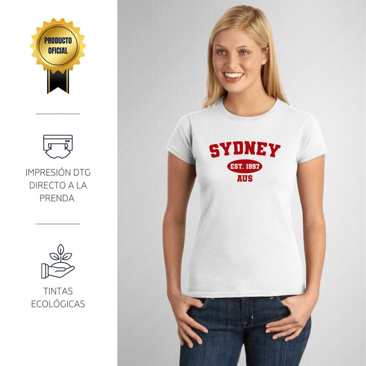 Playera de adulto manga corta, cuello redondo para mujer nueva, diseño Ciudades Sydney Australia original impreso con tecnología DTG (directo a la prenda) tacto cero, uso casual o deportiva, 100% algodón peinado, ajuste semi entallado con costuras laterales. Colores de camiseta para dama: Blanco.