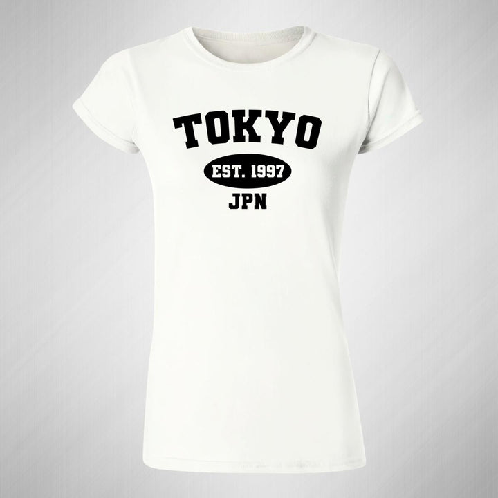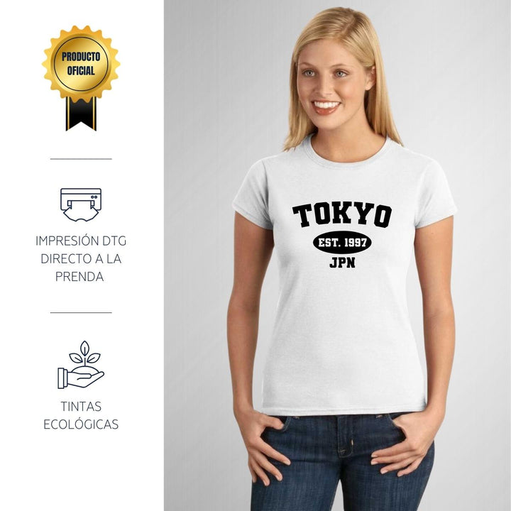 Playera de adulto manga corta, cuello redondo para mujer nueva, diseño Ciudades Tokyo Japón original impreso con tecnología DTG (directo a la prenda) tacto cero, uso casual o deportiva, 100% algodón peinado, ajuste semi entallado con costuras laterales. Colores de camiseta para dama: Blanco.