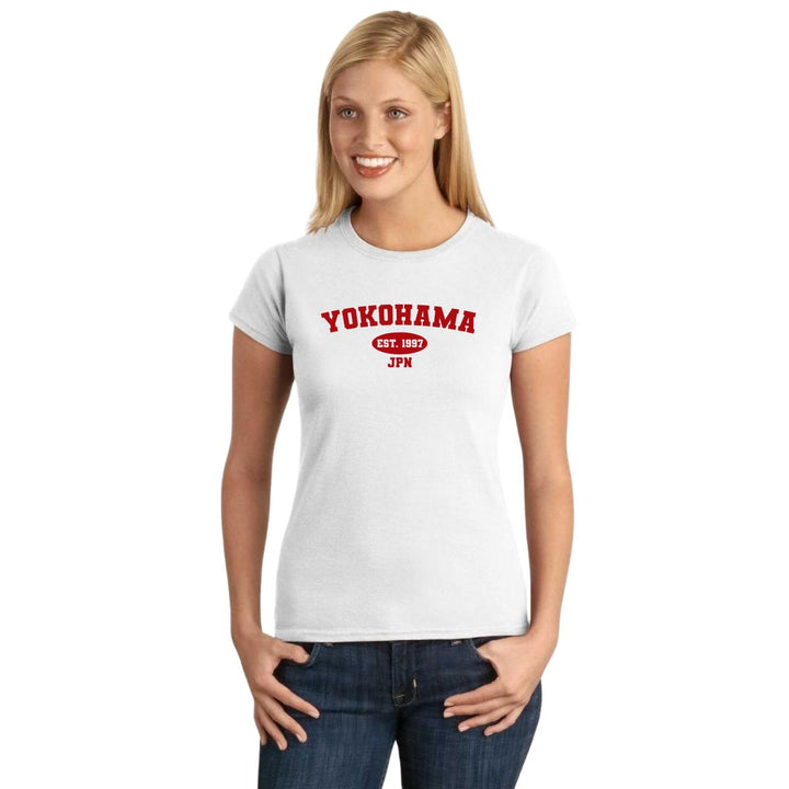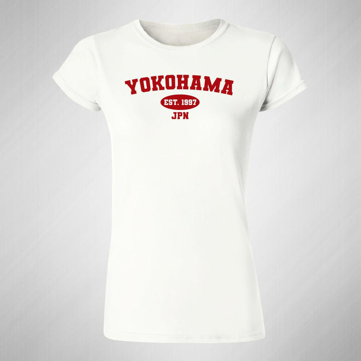 Playera de adulto manga corta, cuello redondo para mujer nueva, diseño Ciudades Yokohama Japón original impreso con tecnología DTG (directo a la prenda) tacto cero, uso casual o deportiva, 100% algodón peinado, ajuste semi entallado con costuras laterales. Colores de camiseta para dama: Blanco.