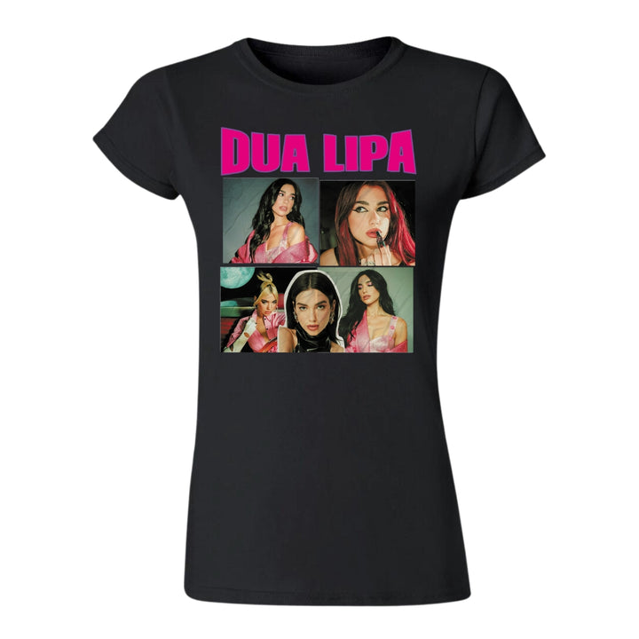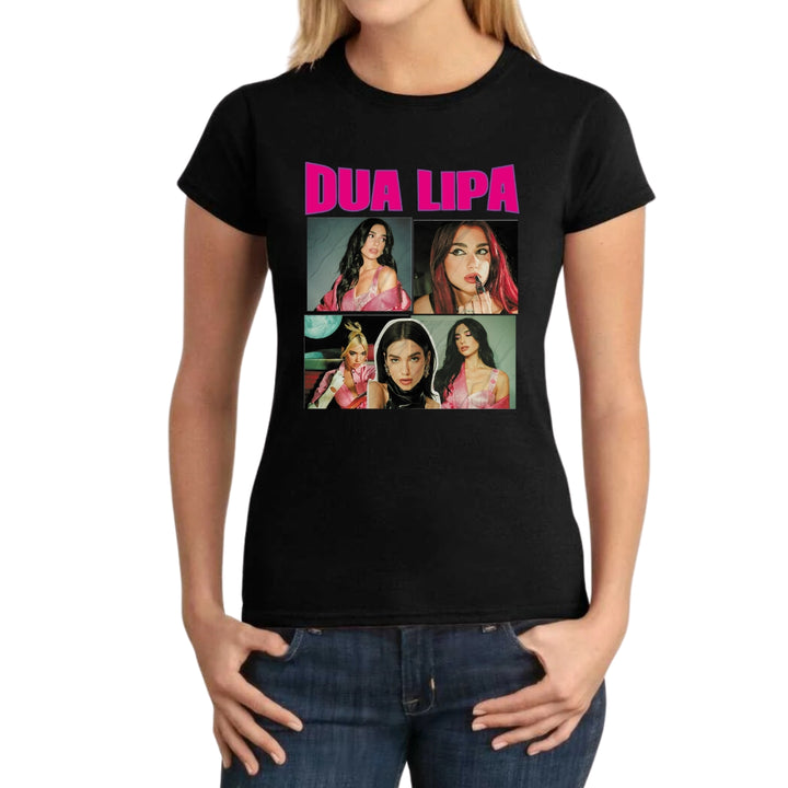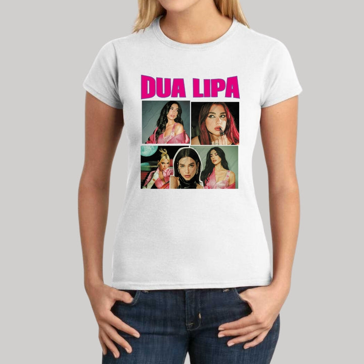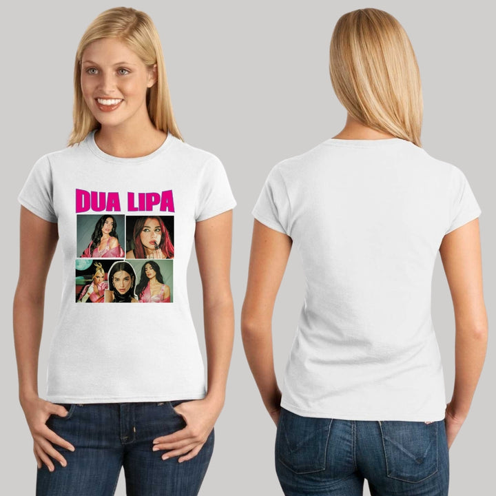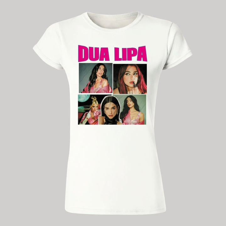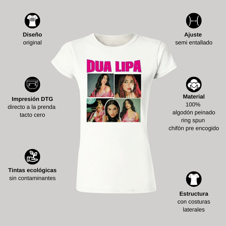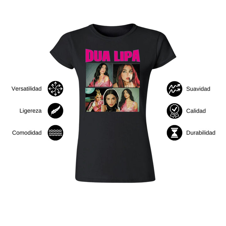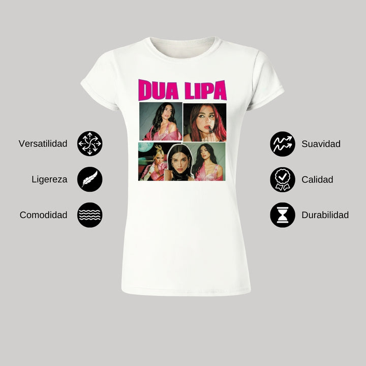Playera de adulto manga corta, cuello redondo para mujer nueva, diseño Dua Lipa Tour original impreso con tecnología DTG (directo a la prenda) tacto cero, uso casual o deportiva, 100% algodón peinado, ajuste semi entallado con costuras laterales.