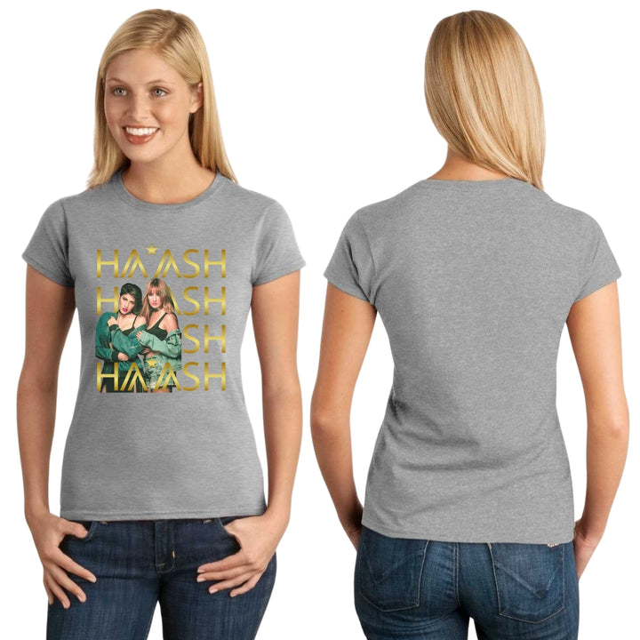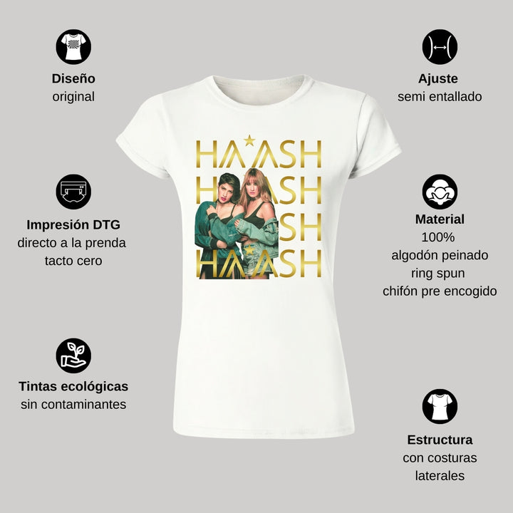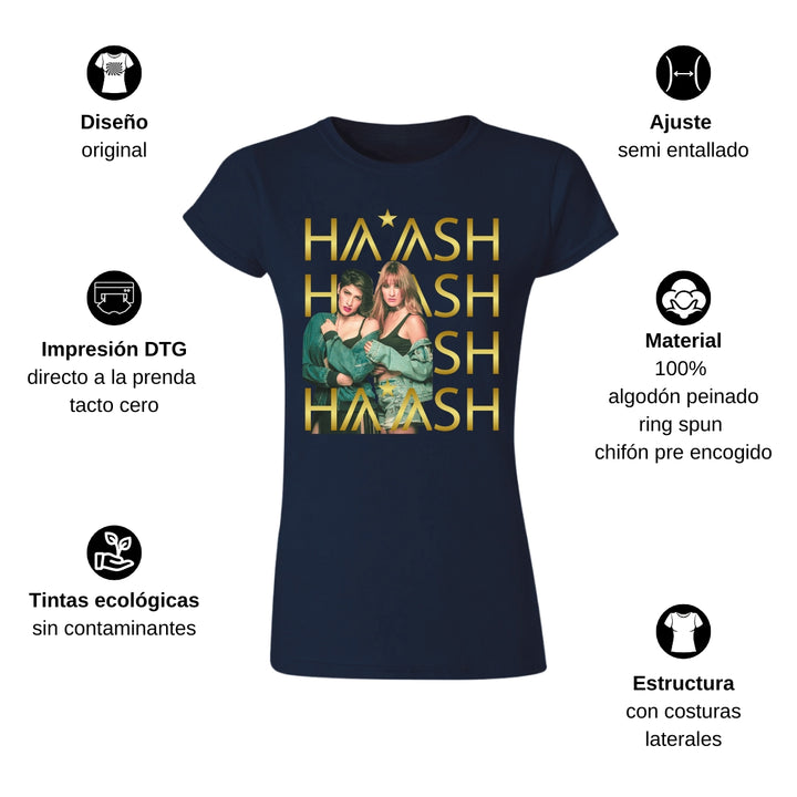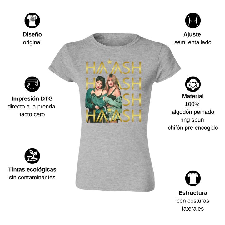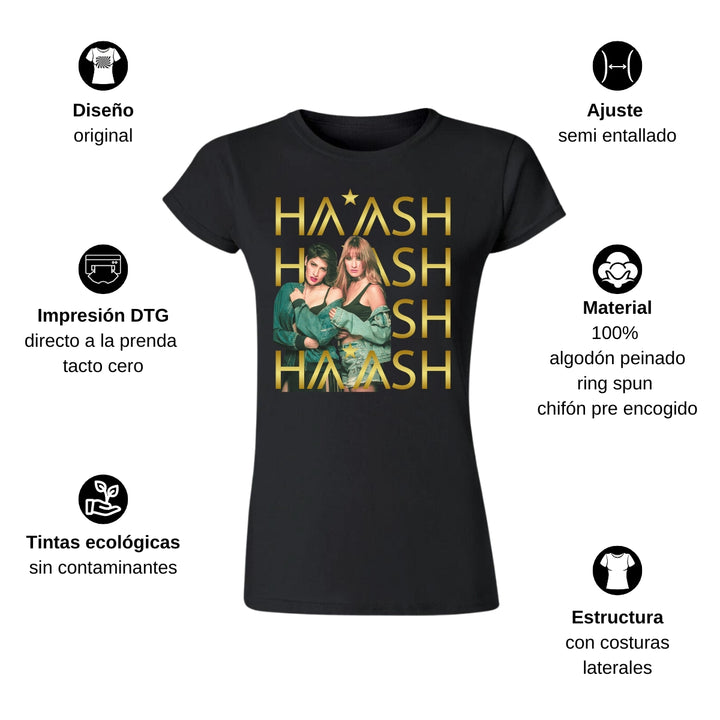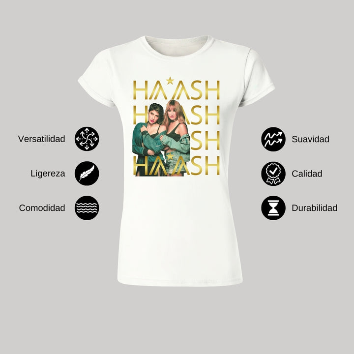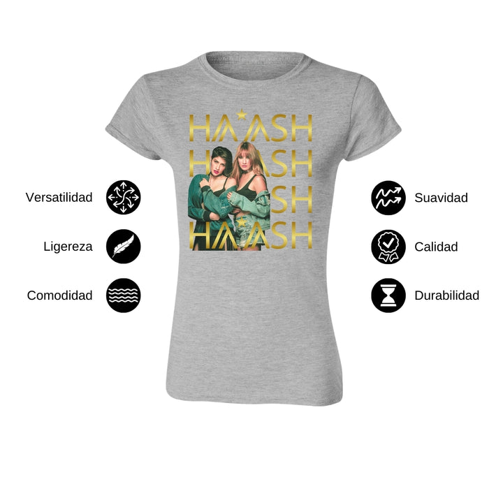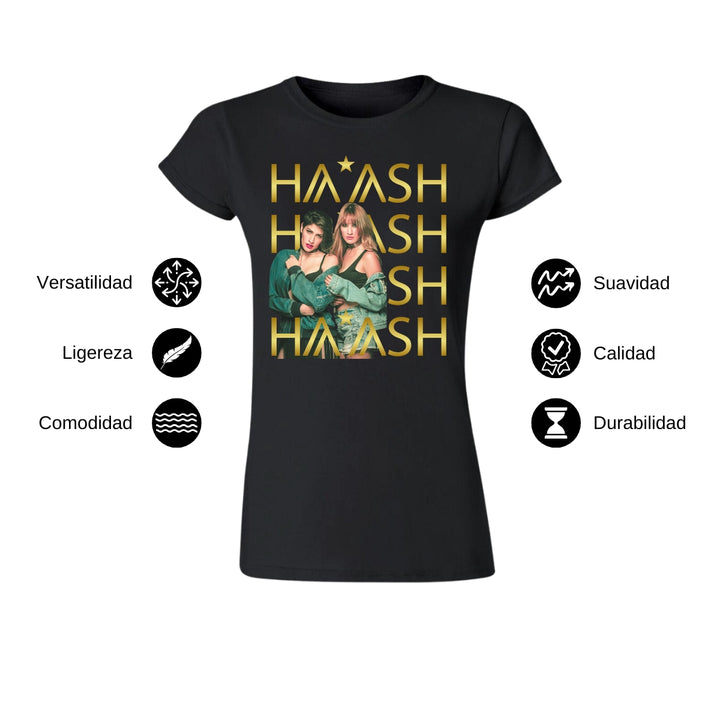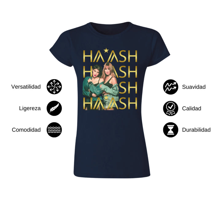 Playera de adulto manga corta, cuello redondo para mujer nueva, diseño HA-ASH Concierto original impreso con tecnología DTG (directo a la prenda) tacto cero, uso casual o deportiva, 100% algodón peinado, ajuste semi entallado con costuras laterales. Colores de camiseta para dama: Negro, Blanco, Azul Marino, Gris.