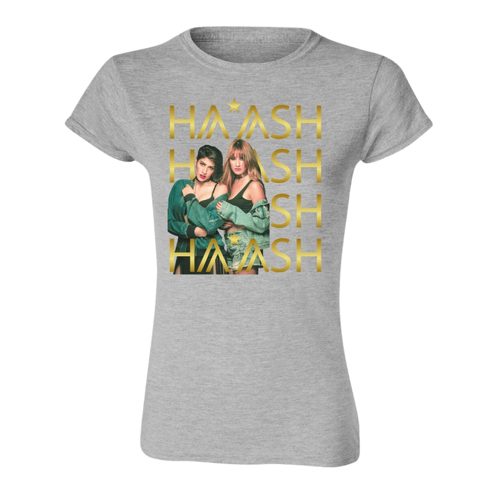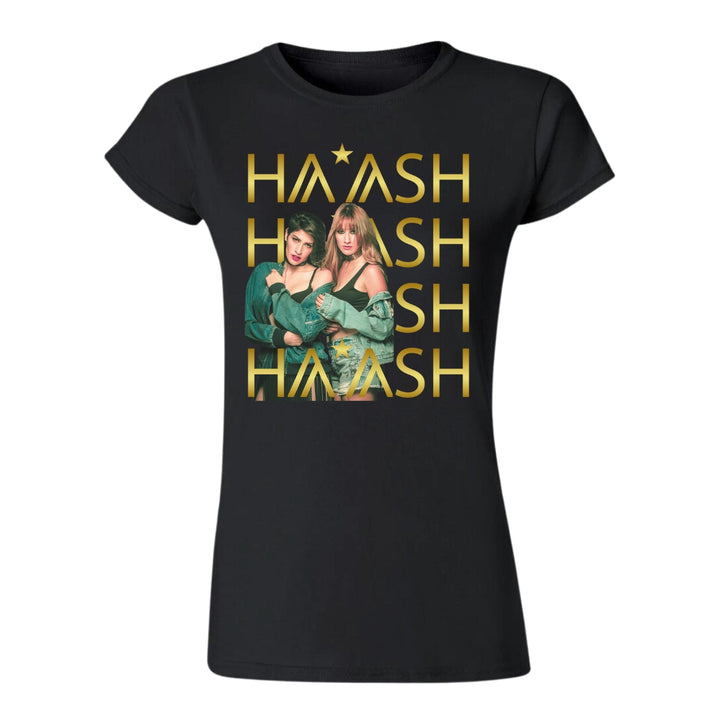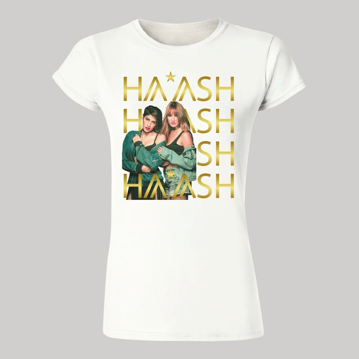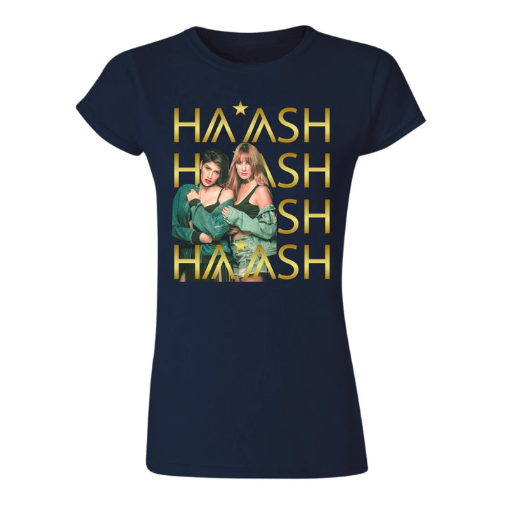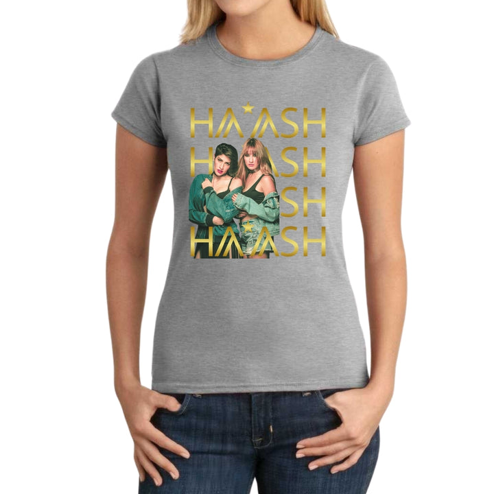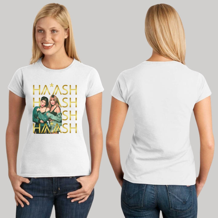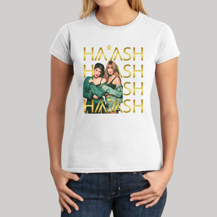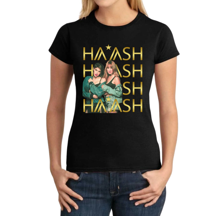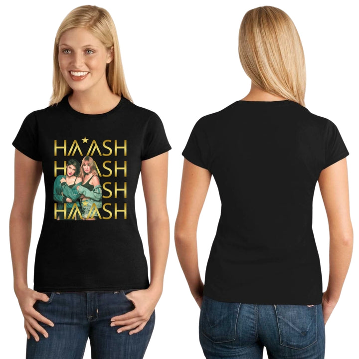 Playera de adulto manga corta, cuello redondo para mujer nueva, diseño HA-ASH Concierto original impreso con tecnología DTG (directo a la prenda) tacto cero, uso casual o deportiva, 100% algodón peinado, ajuste semi entallado con costuras laterales. Colores de camiseta para dama: Negro, Blanco, Azul Marino, Gris.