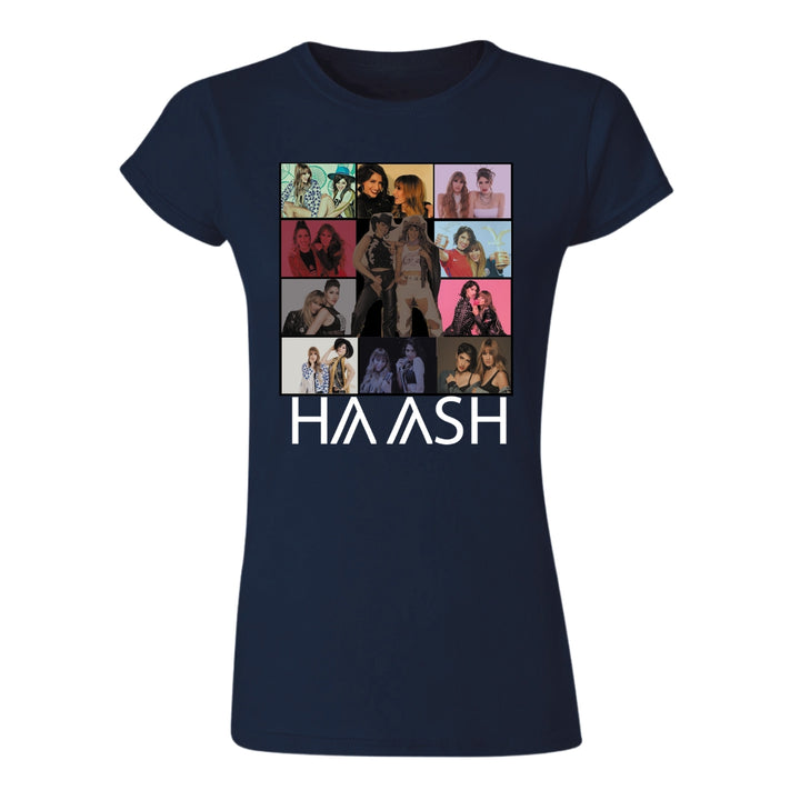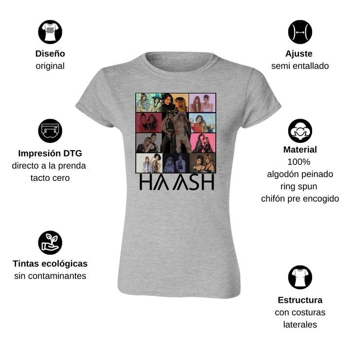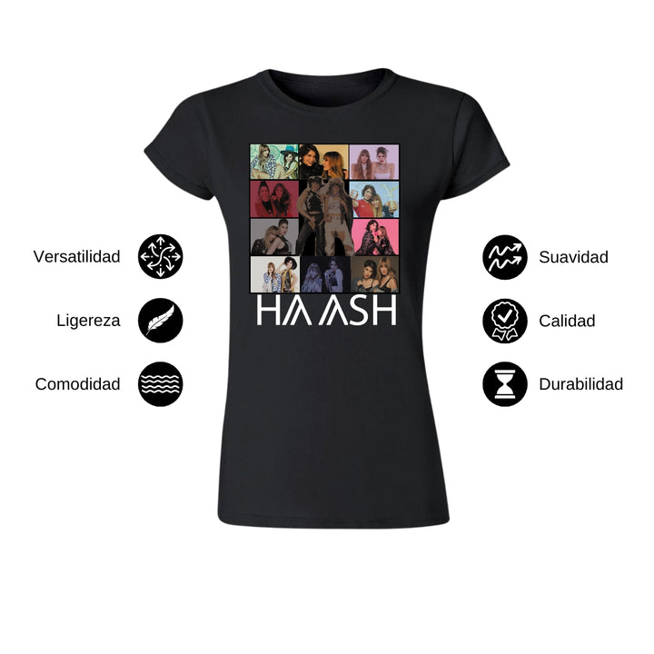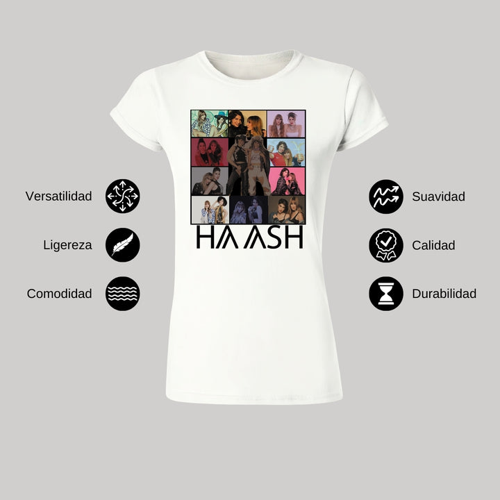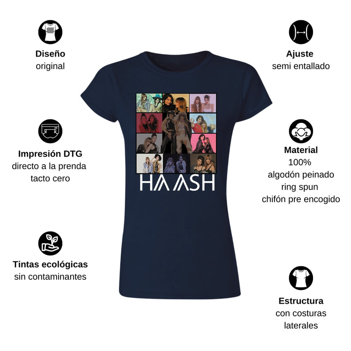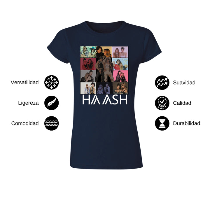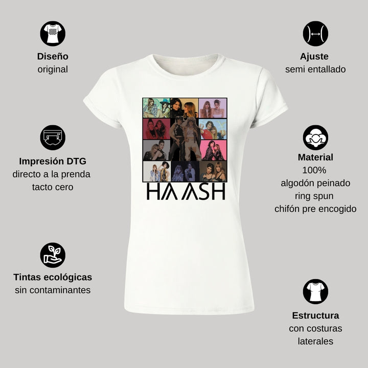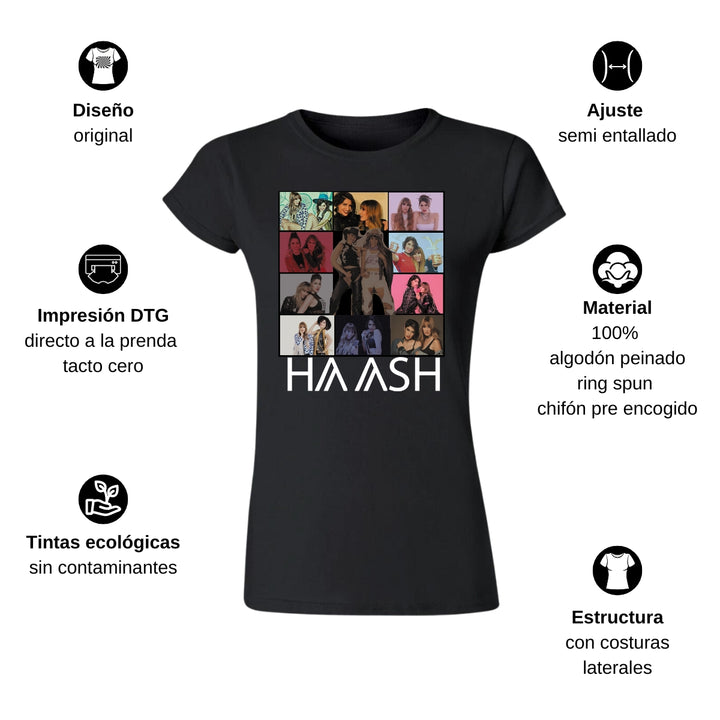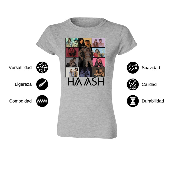 Playera de adulto manga corta, cuello redondo para mujer nueva, diseño HA-ASH Concierto Tour original impreso con tecnología DTG (directo a la prenda) tacto cero, uso casual o deportiva, 100% algodón peinado, ajuste semi entallado con costuras laterales. Colores de camiseta para dama: Negro, Blanco, Azul Marino, Gris.