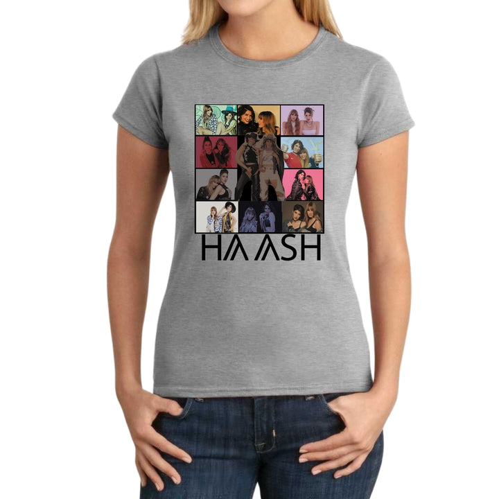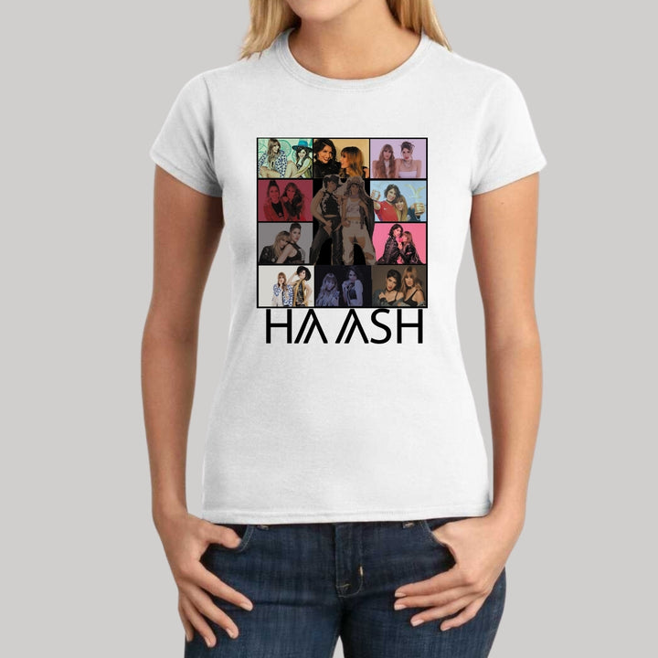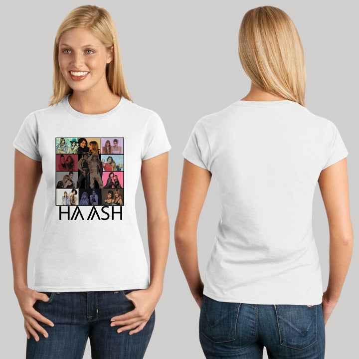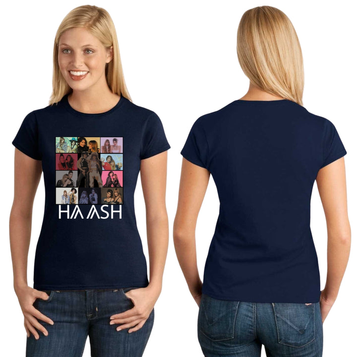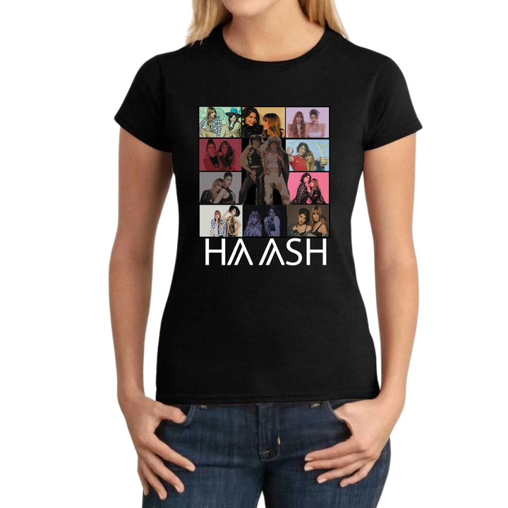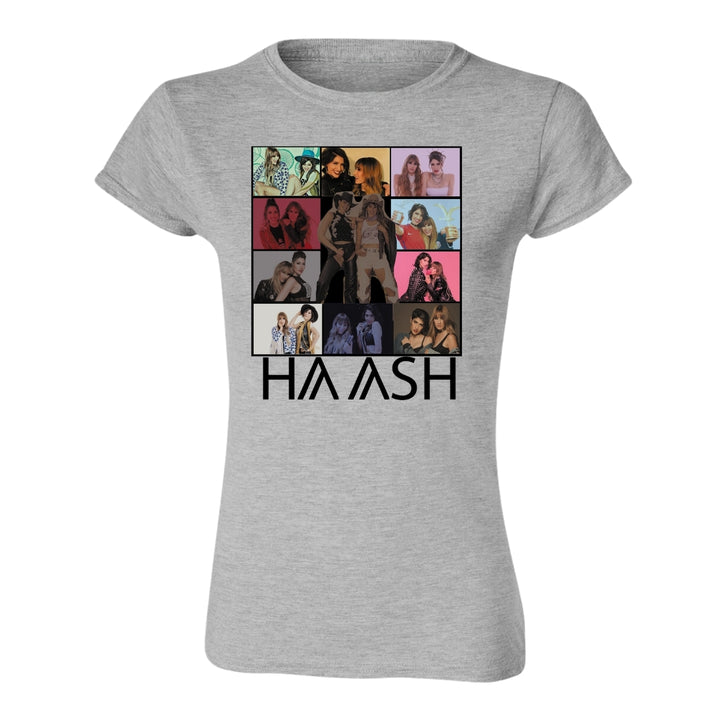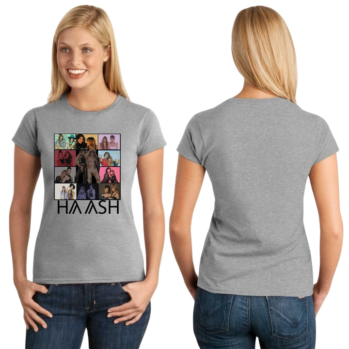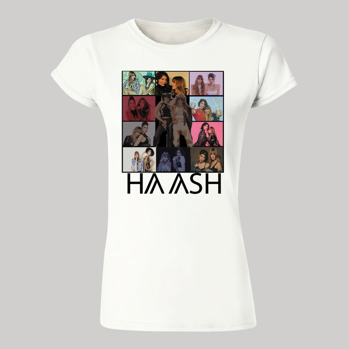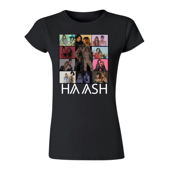 Playera de adulto manga corta, cuello redondo para mujer nueva, diseño HA-ASH Concierto Tour original impreso con tecnología DTG (directo a la prenda) tacto cero, uso casual o deportiva, 100% algodón peinado, ajuste semi entallado con costuras laterales. Colores de camiseta para dama: Negro, Blanco, Azul Marino, Gris.