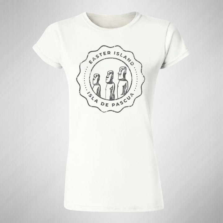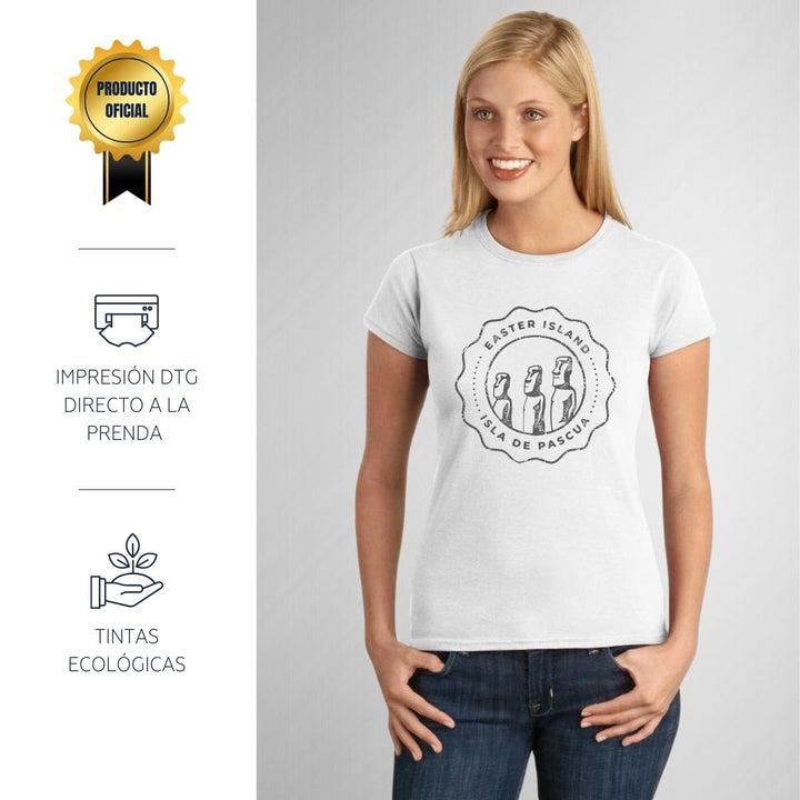 Playera de adulto manga corta, cuello redondo para mujer nueva, diseño Isla de Pascua Chile original impreso con tecnología DTG (directo a la prenda) tacto cero, uso casual o deportiva, 100% algodón peinado, ajuste semi entallado con costuras laterales. Colores de camiseta para dama: Blanco.