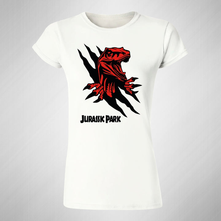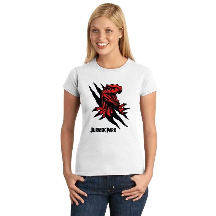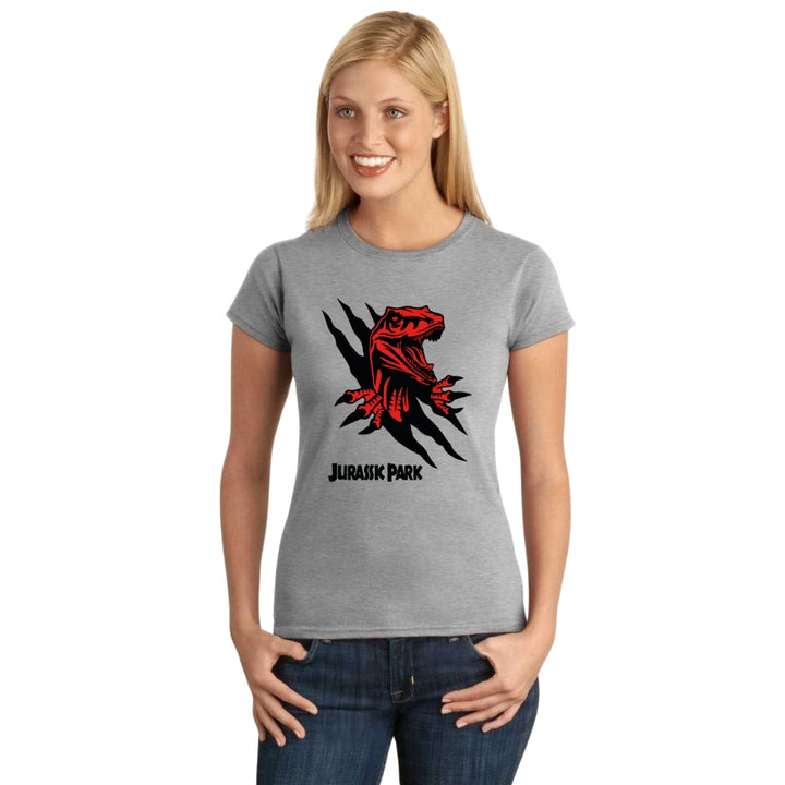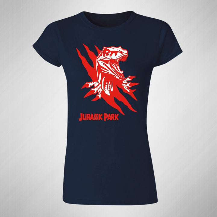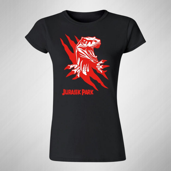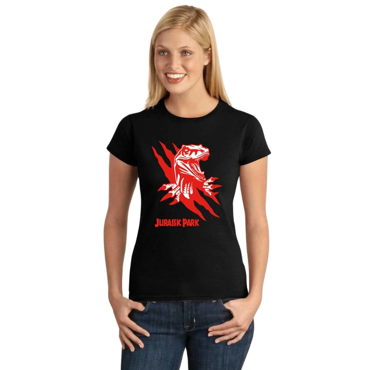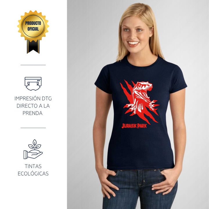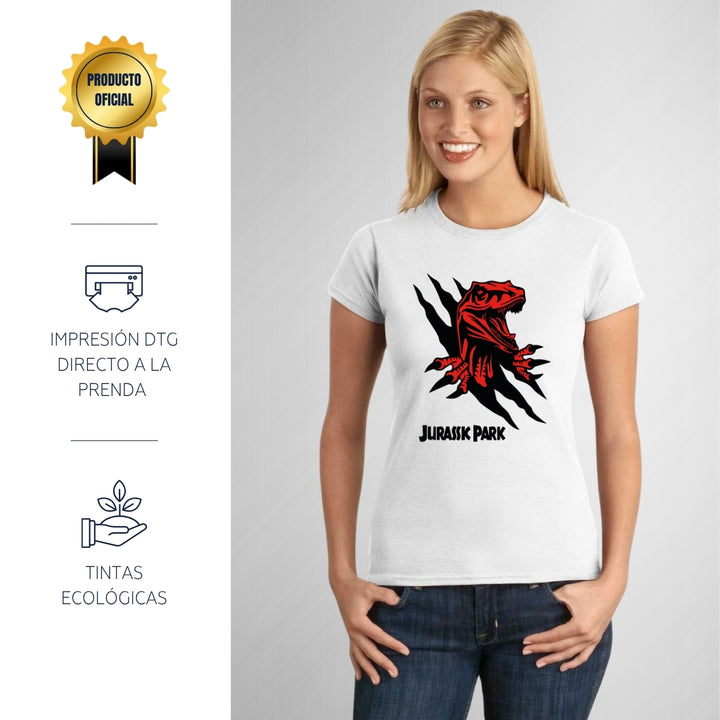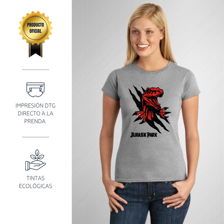 Playera de adulto manga corta, cuello redondo para mujer nueva, diseño Jurassic Park Película original impreso con tecnología DTG (directo a la prenda) tacto cero, uso casual o deportiva, 100% algodón peinado, ajuste semi entallado con costuras laterales. Colores de camiseta para dama: Negro, Blanco, Azul Marino, Gris.