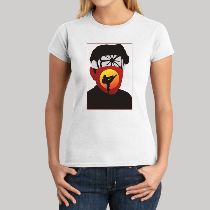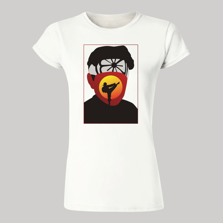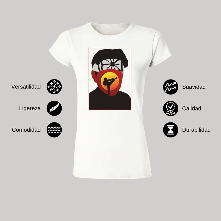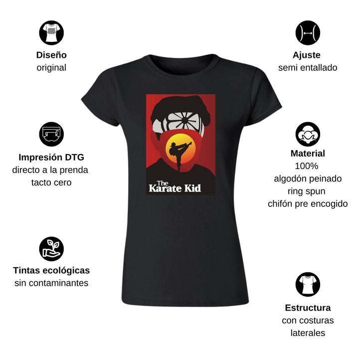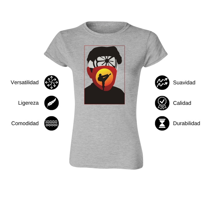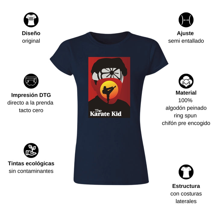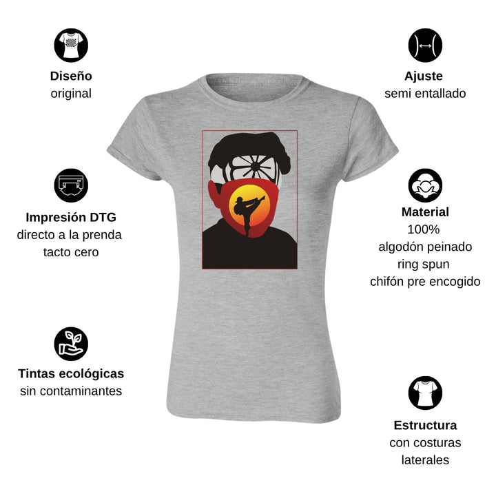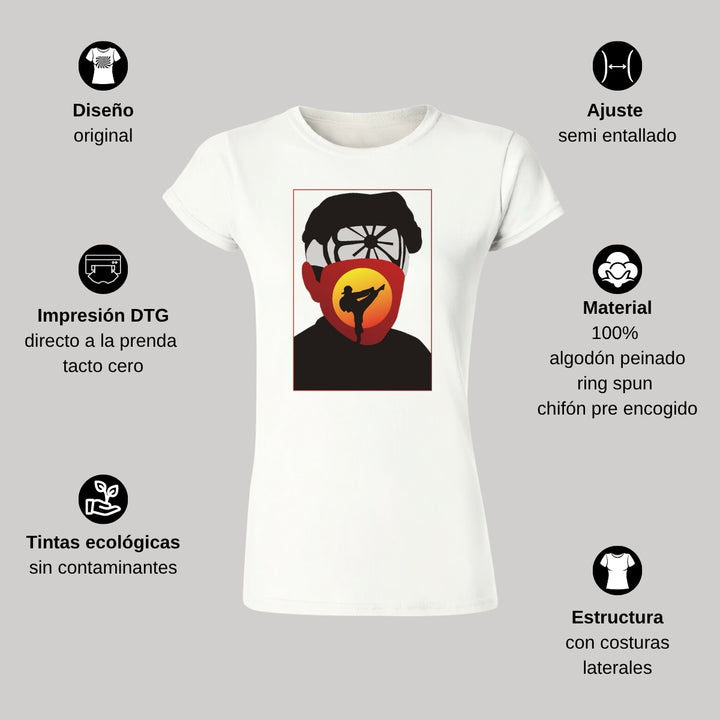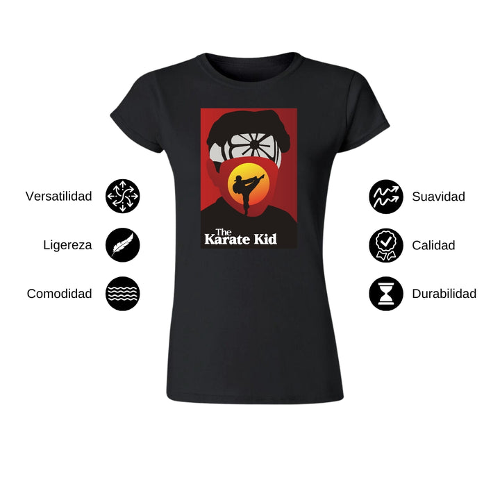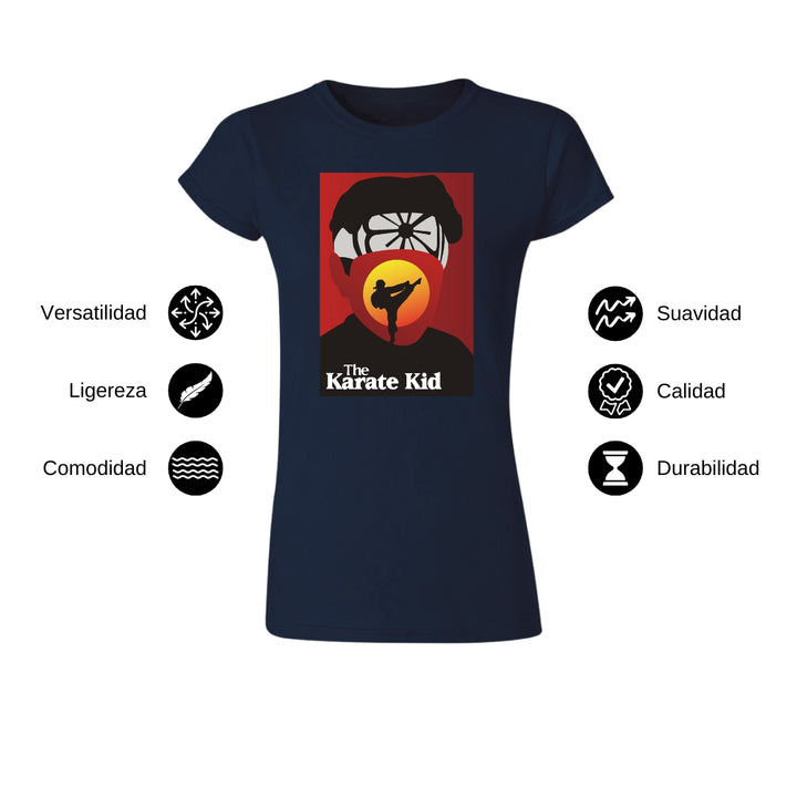 Playera de adulto manga corta, cuello redondo para mujer nueva, diseño Karate Kid original impreso con tecnología DTG (directo a la prenda) tacto cero, uso casual o deportiva, 100% algodón peinado, ajuste semi entallado con costuras laterales. Colores de camiseta para dama: Negro, Blanco, Azul Marino, Gris.