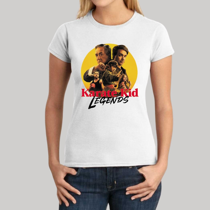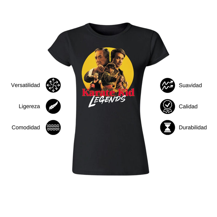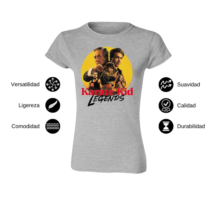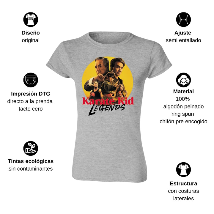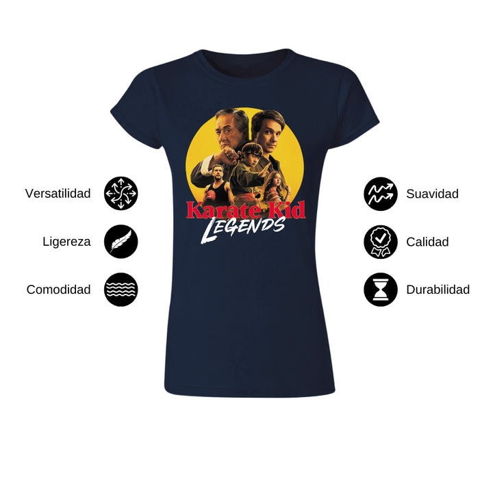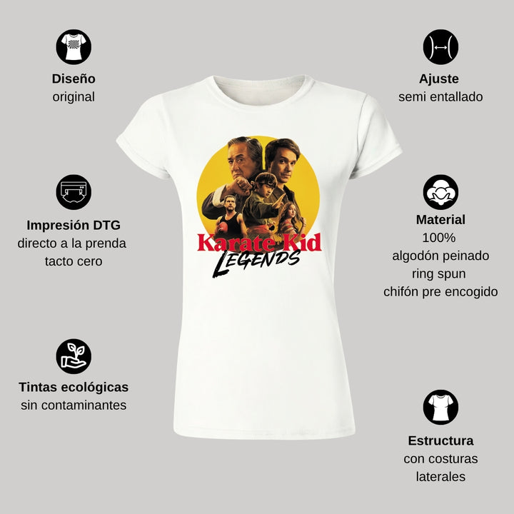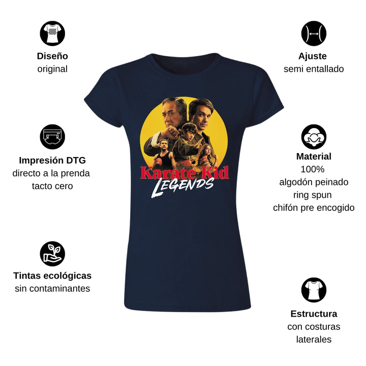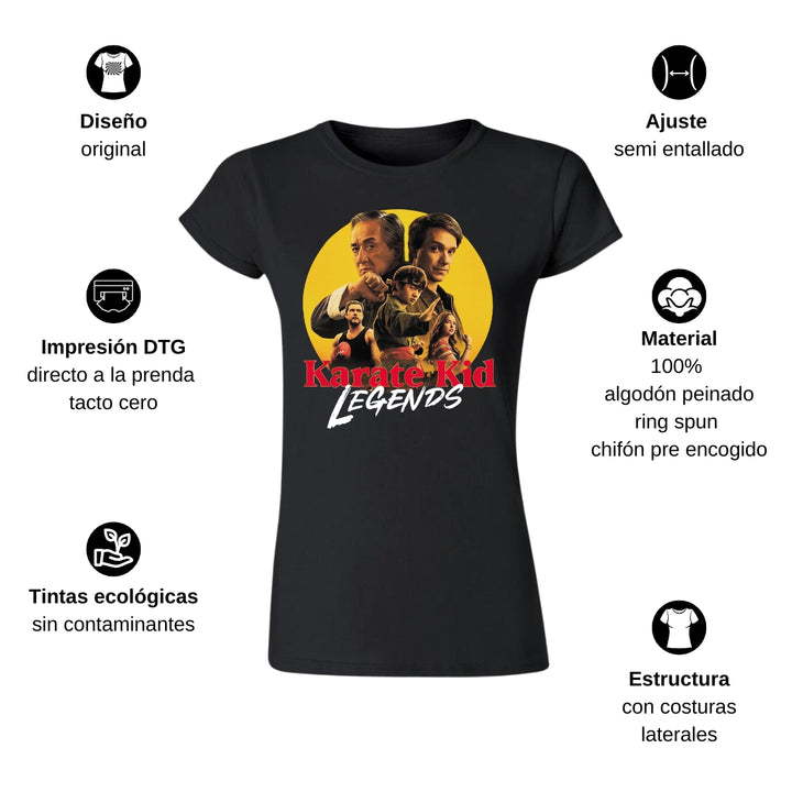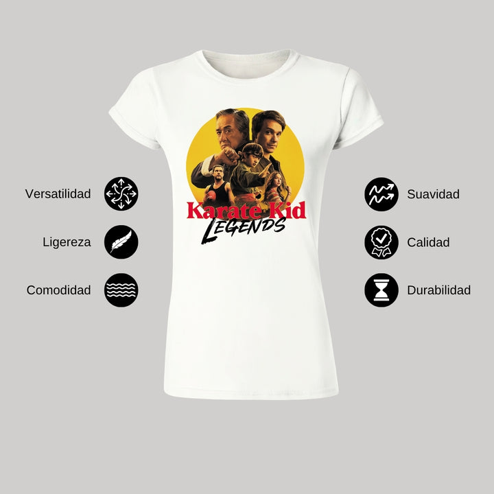 Playera de adulto manga corta, cuello redondo para mujer nueva, diseño Karate Kid Leyendas original impreso con tecnología DTG (directo a la prenda) tacto cero, uso casual o deportiva, 100% algodón peinado, ajuste semi entallado con costuras laterales. Colores de camiseta para dama: Negro, Blanco, Azul Marino, Gris.