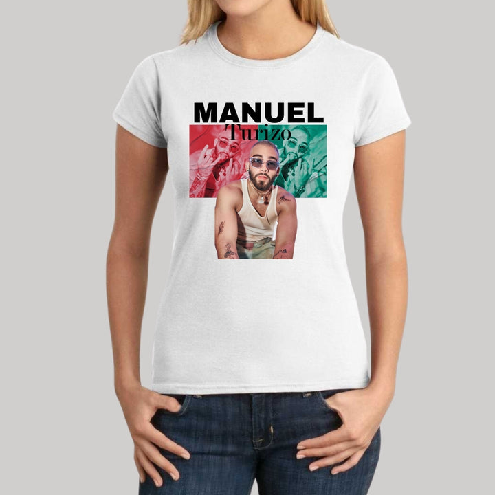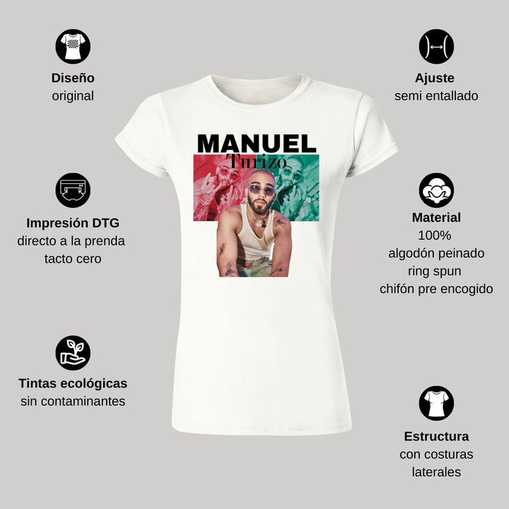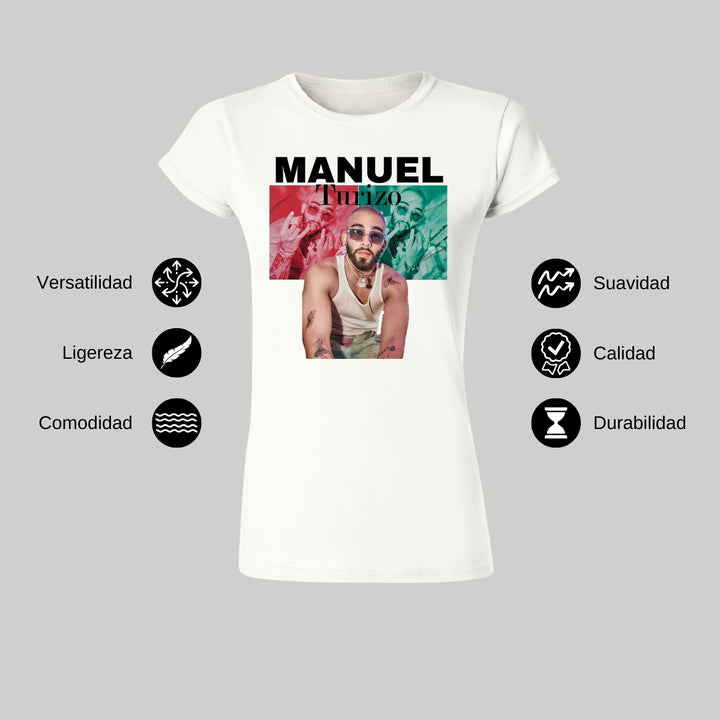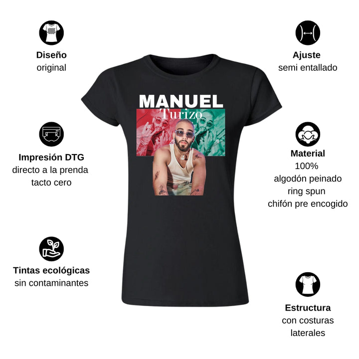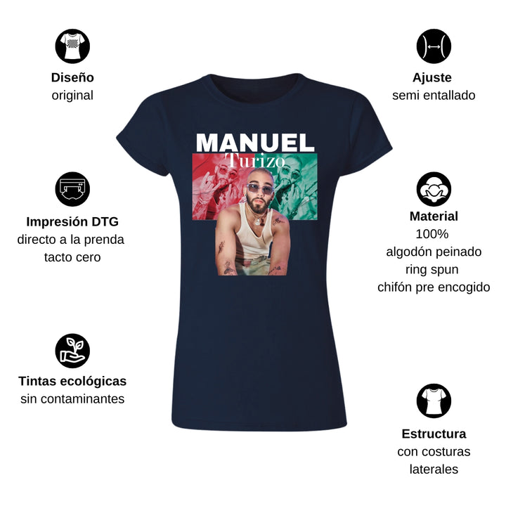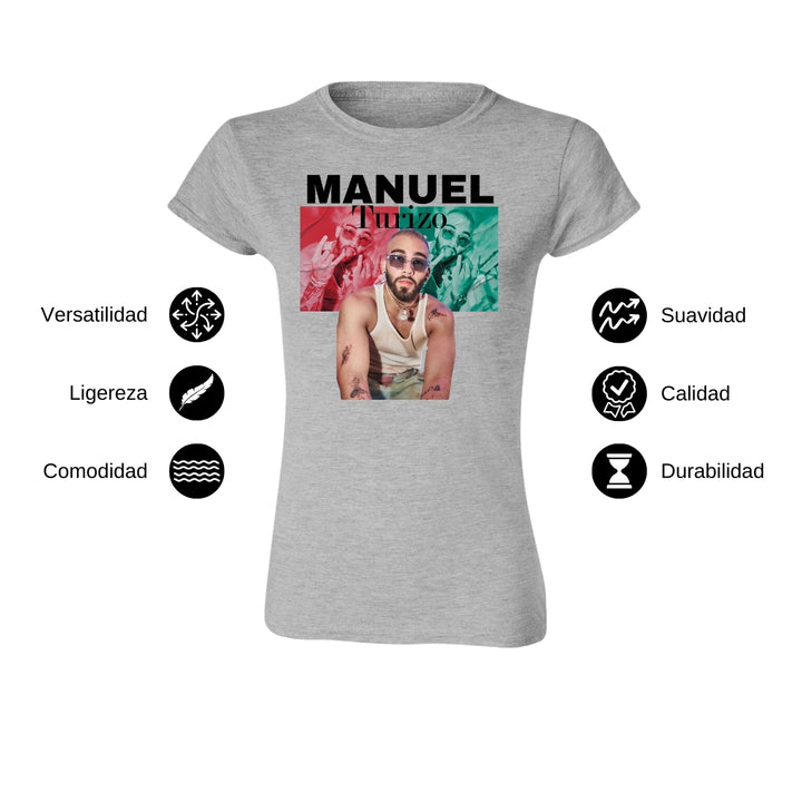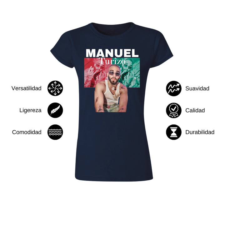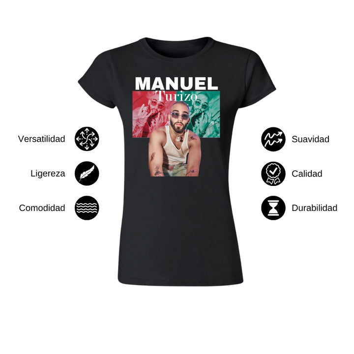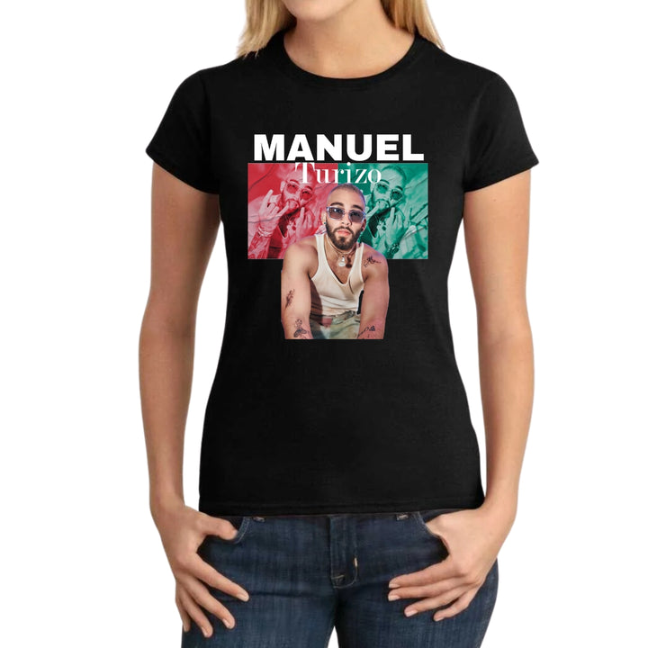 Playera de adulto manga corta, cuello redondo para mujer nueva, diseño Manuel Turizo original impreso con tecnología DTG (directo a la prenda) tacto cero, uso casual o deportiva, 100% algodón peinado, ajuste semi entallado con costuras laterales. Colores de camiseta para dama: Negro, Blanco, Azul Marino, Gris.