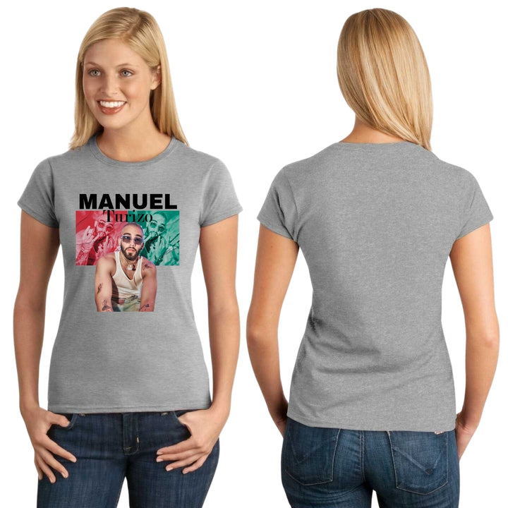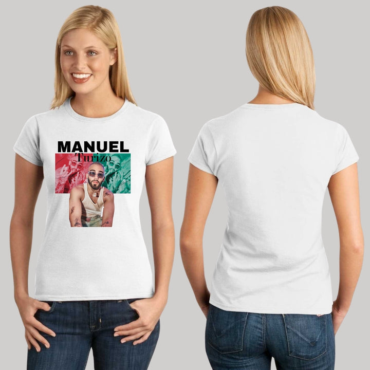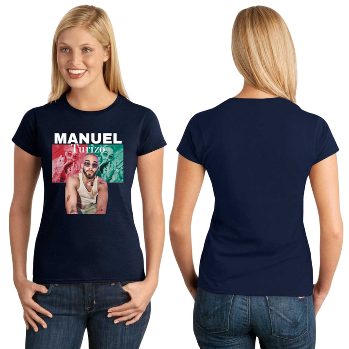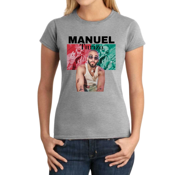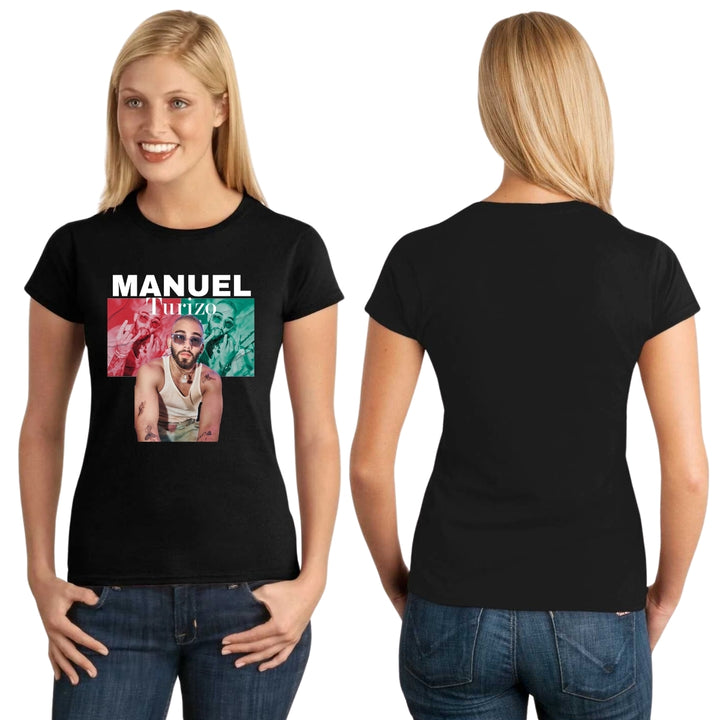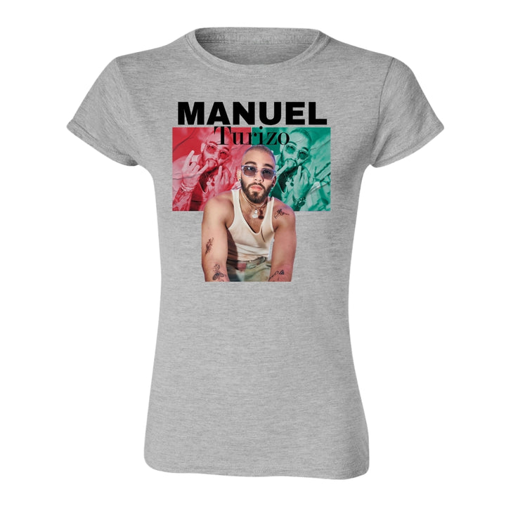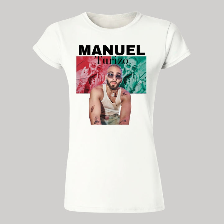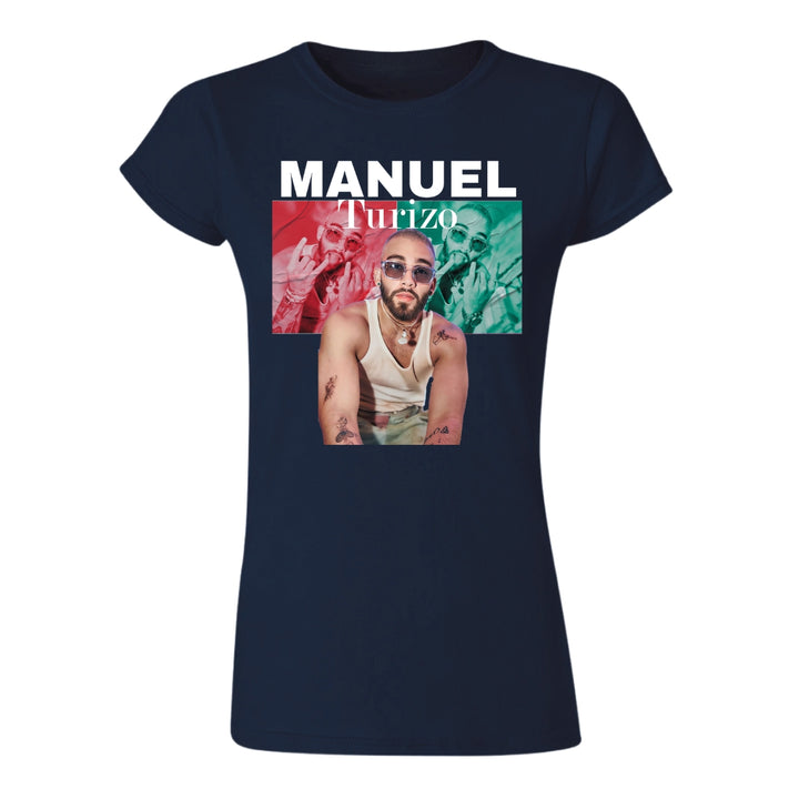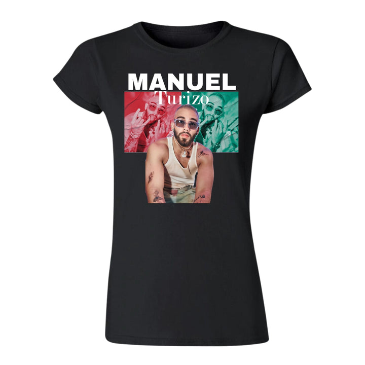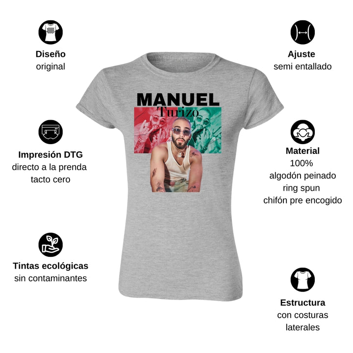 Playera de adulto manga corta, cuello redondo para mujer nueva, diseño Manuel Turizo original impreso con tecnología DTG (directo a la prenda) tacto cero, uso casual o deportiva, 100% algodón peinado, ajuste semi entallado con costuras laterales. Colores de camiseta para dama: Negro, Blanco, Azul Marino, Gris.