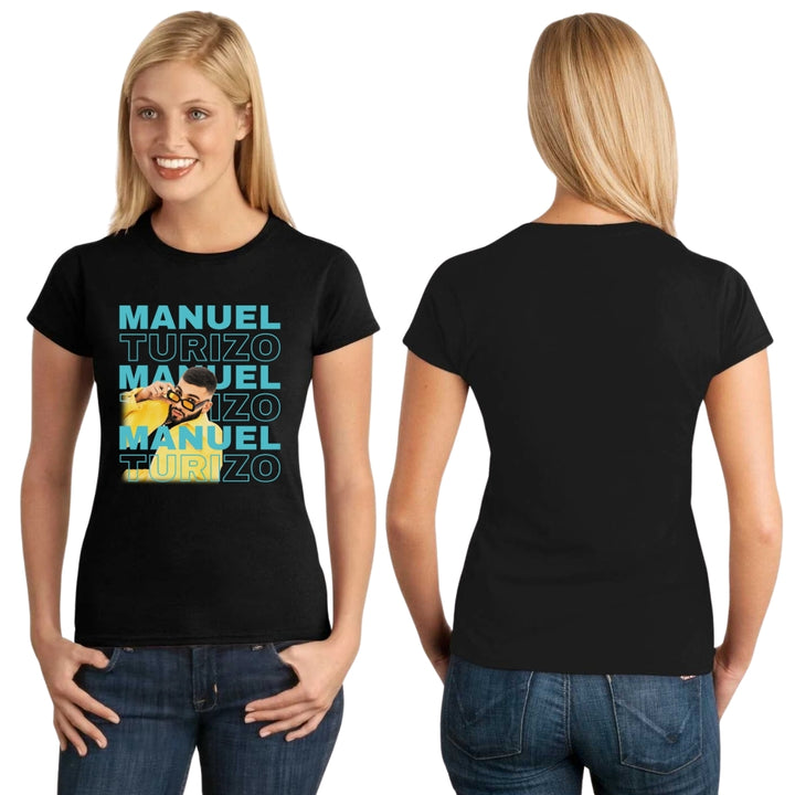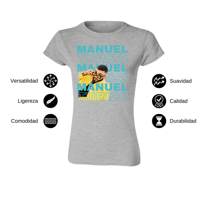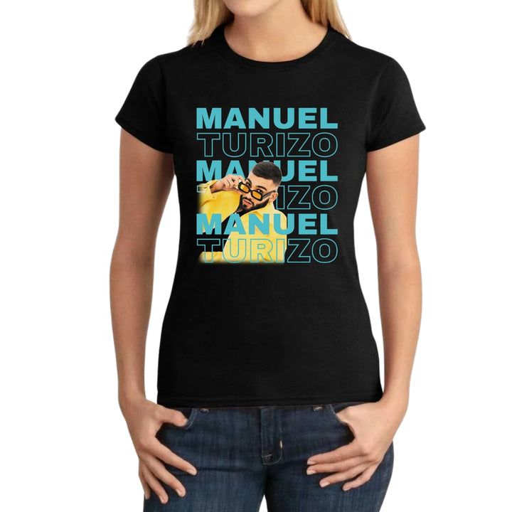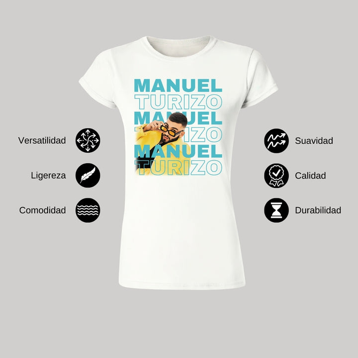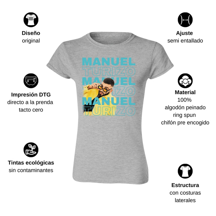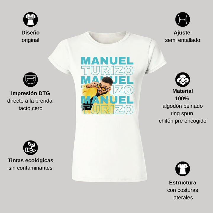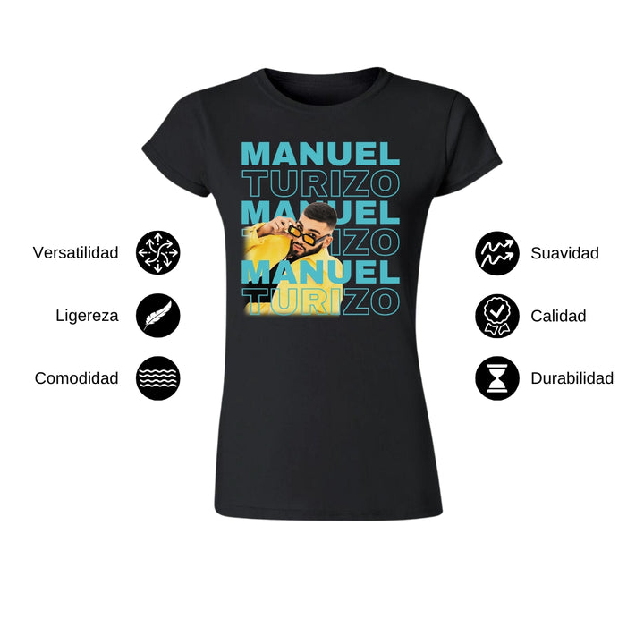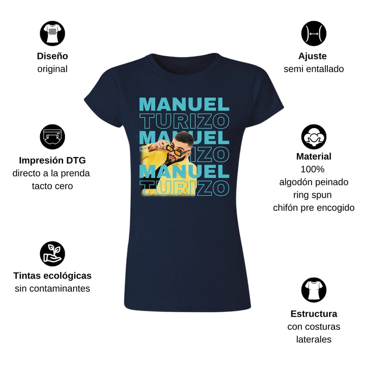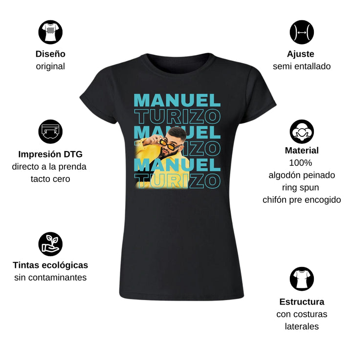Playera de adulto manga corta, cuello redondo para mujer nueva, diseño Manuel Turizo Tour original impreso con tecnología DTG (directo a la prenda) tacto cero, uso casual o deportiva, 100% algodón peinado, ajuste semi entallado con costuras laterales. Colores de camiseta para dama: Negro, Blanco, Azul Marino, Gris.