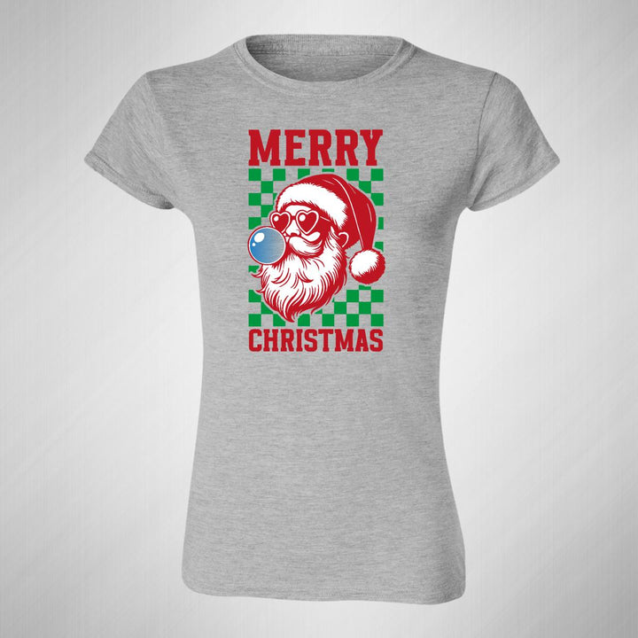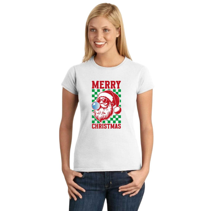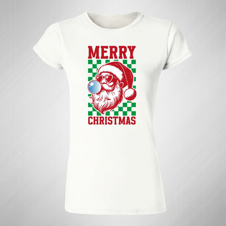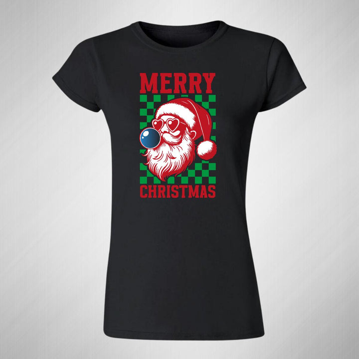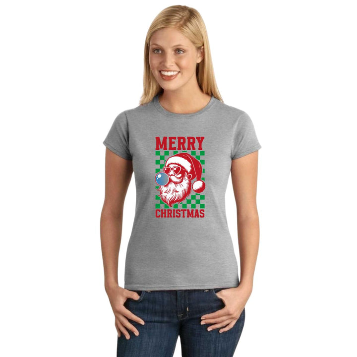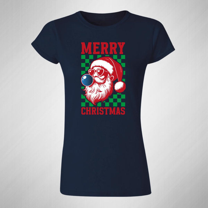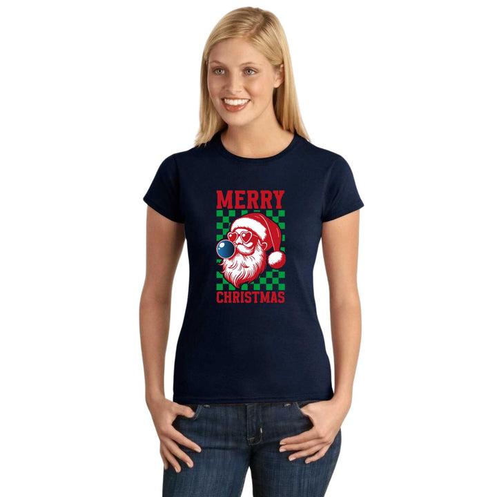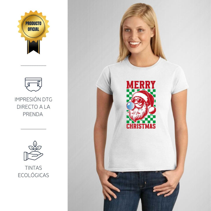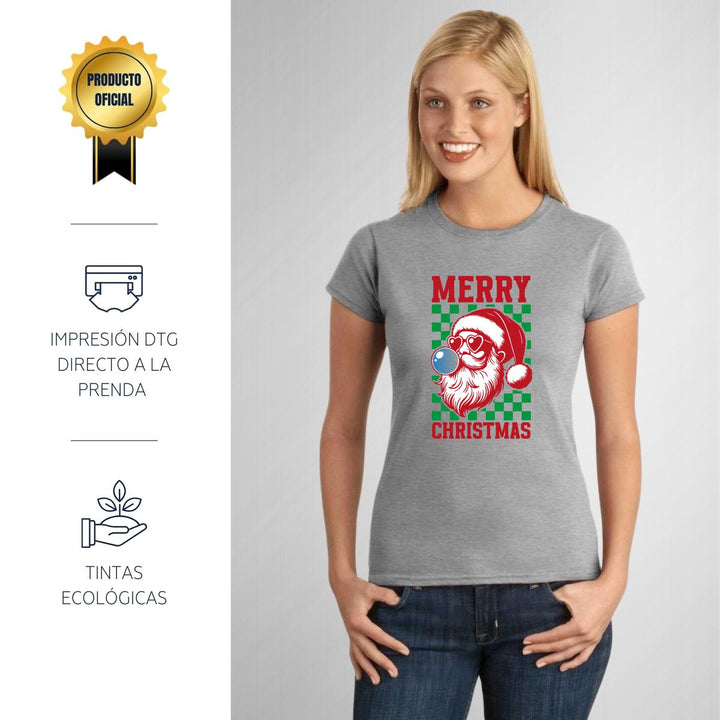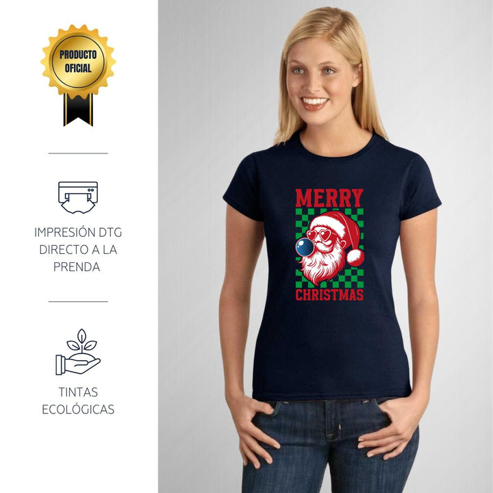 Playera de adulto manga corta, cuello redondo para mujer nueva, diseño Merry Christmas original impreso con tecnología DTG (directo a la prenda) tacto cero, uso casual o deportiva, 100% algodón peinado, ajuste semi entallado con costuras laterales. Colores de camiseta para dama: Negro, Blanco, Azul Marino, Gris.