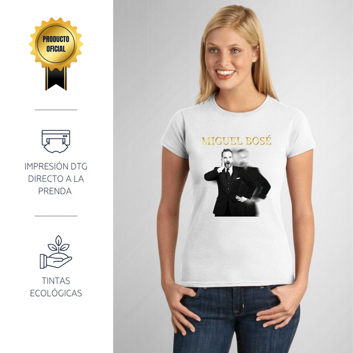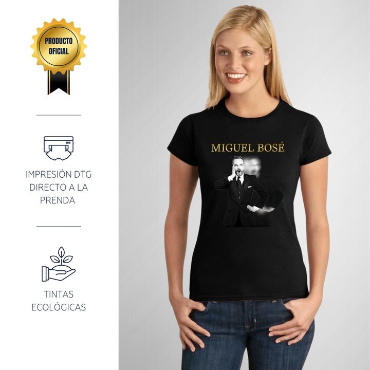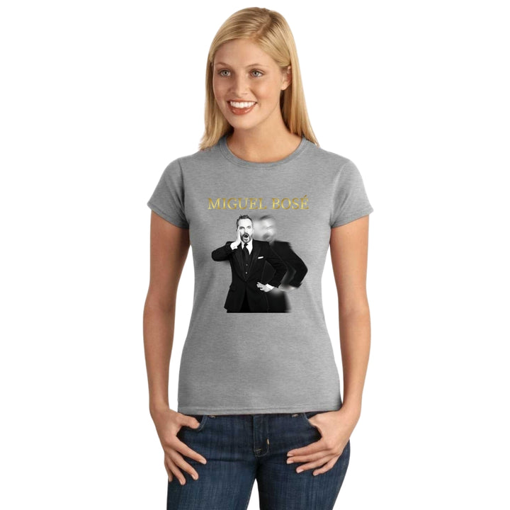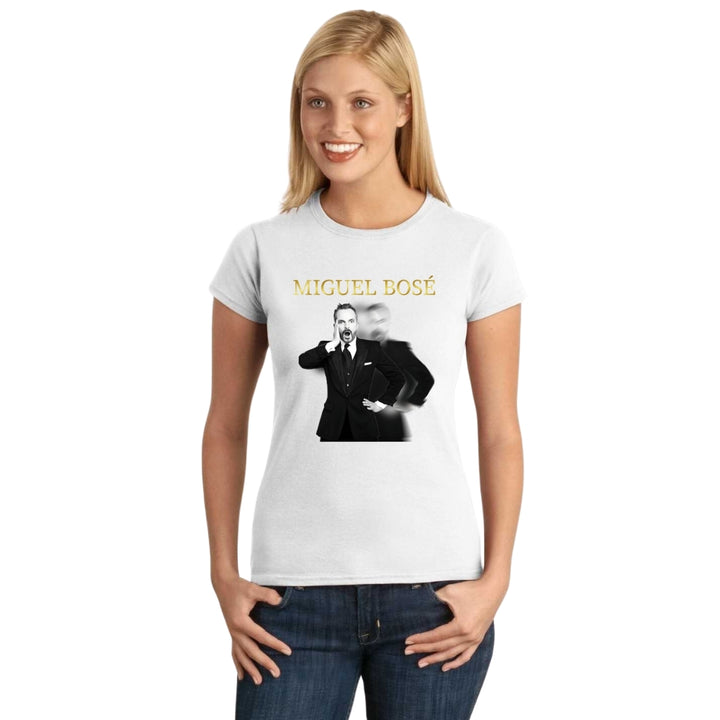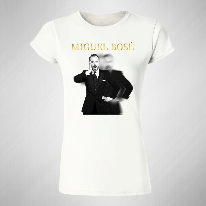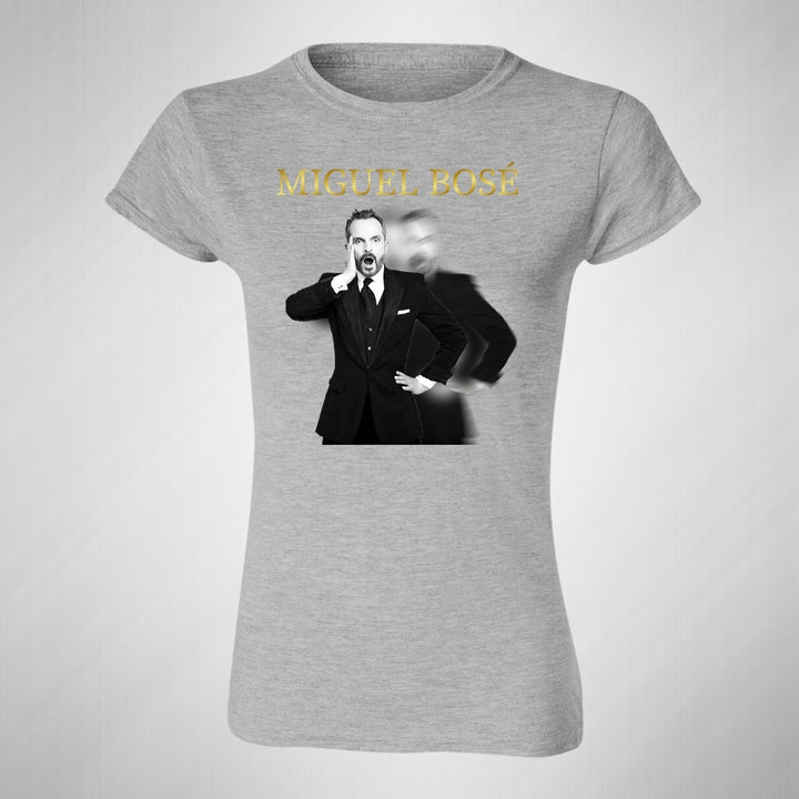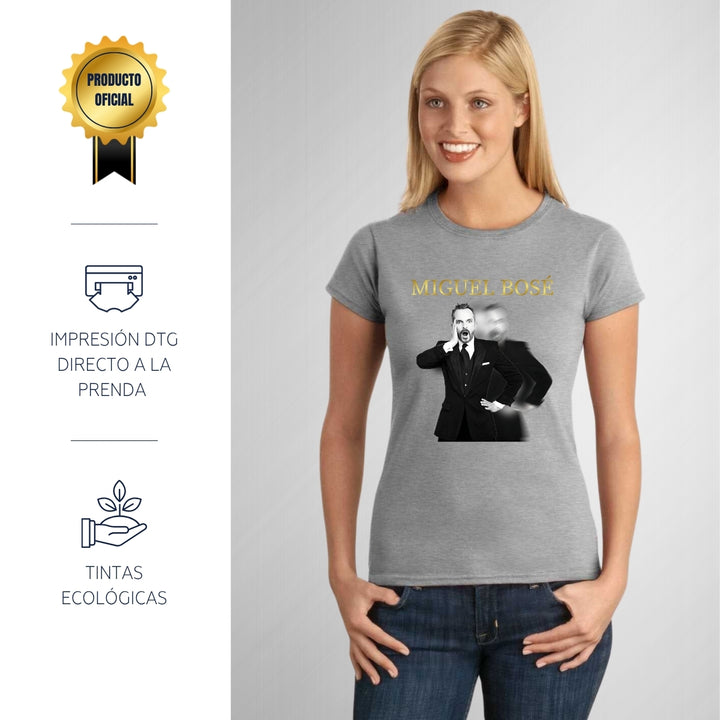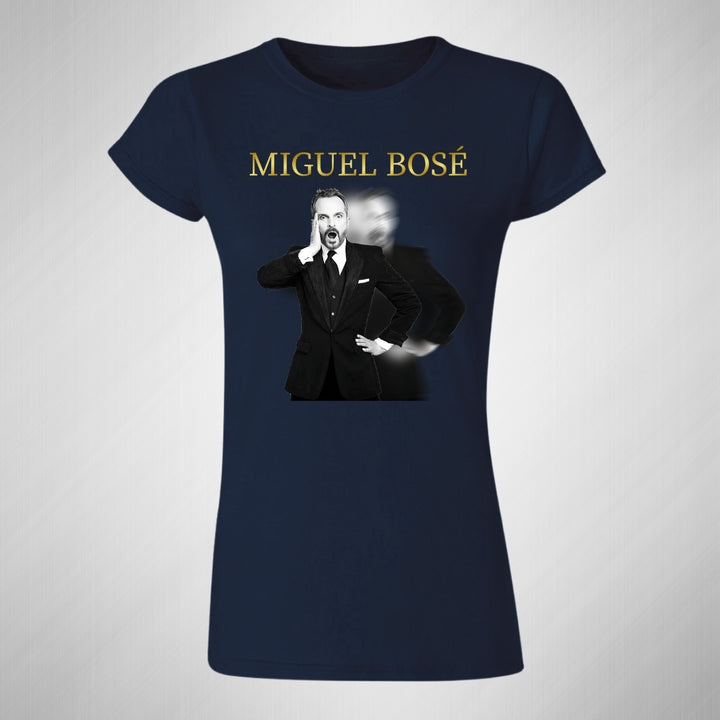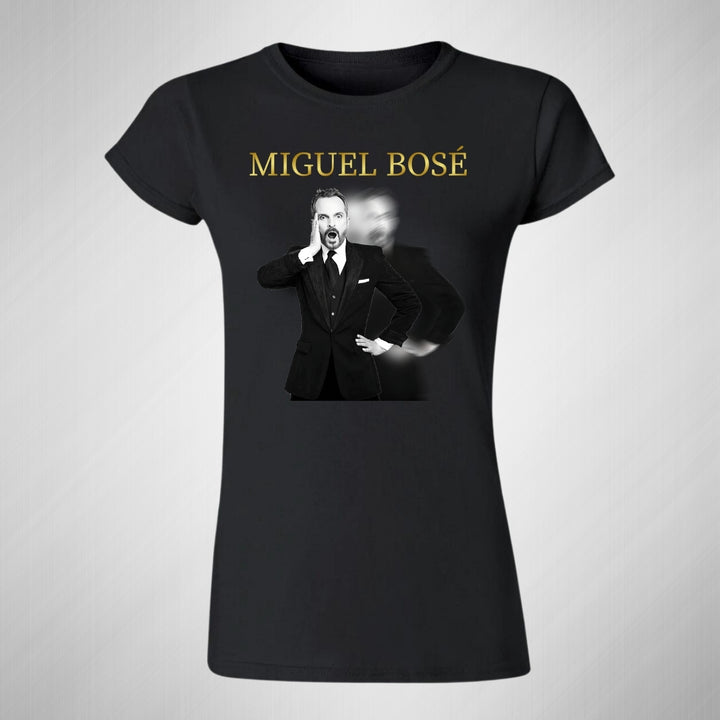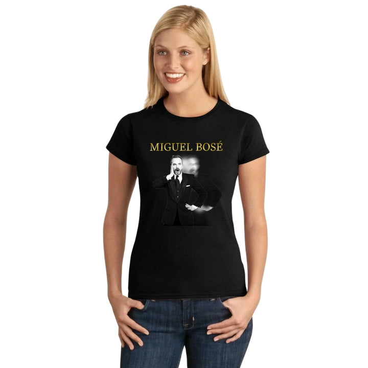 Playera de adulto manga corta, cuello redondo para mujer nueva, diseño Miguel Bosé Concierto original impreso con tecnología DTG (directo a la prenda) tacto cero, uso casual o deportiva, 100% algodón peinado, ajuste semi entallado con costuras laterales. Colores de camiseta para dama: Negro, Blanco, Azul Marino, Gris.