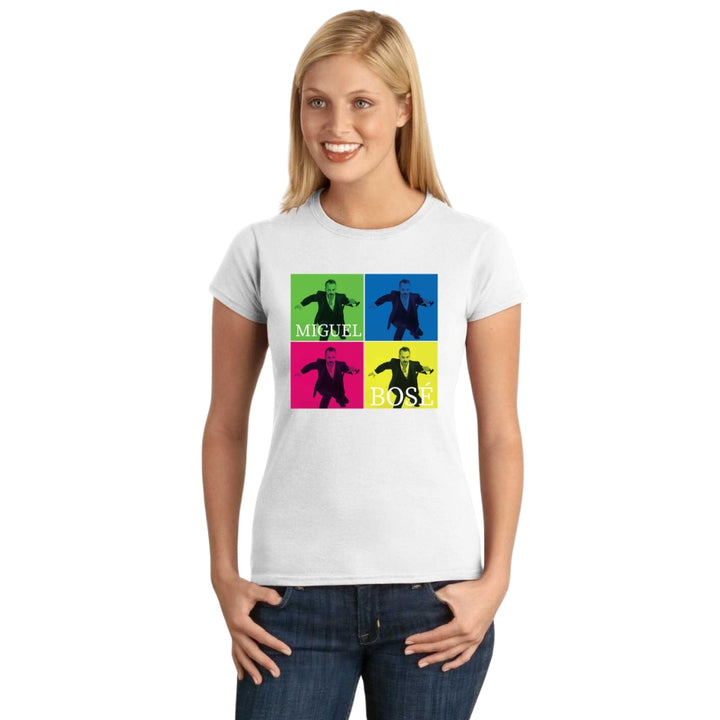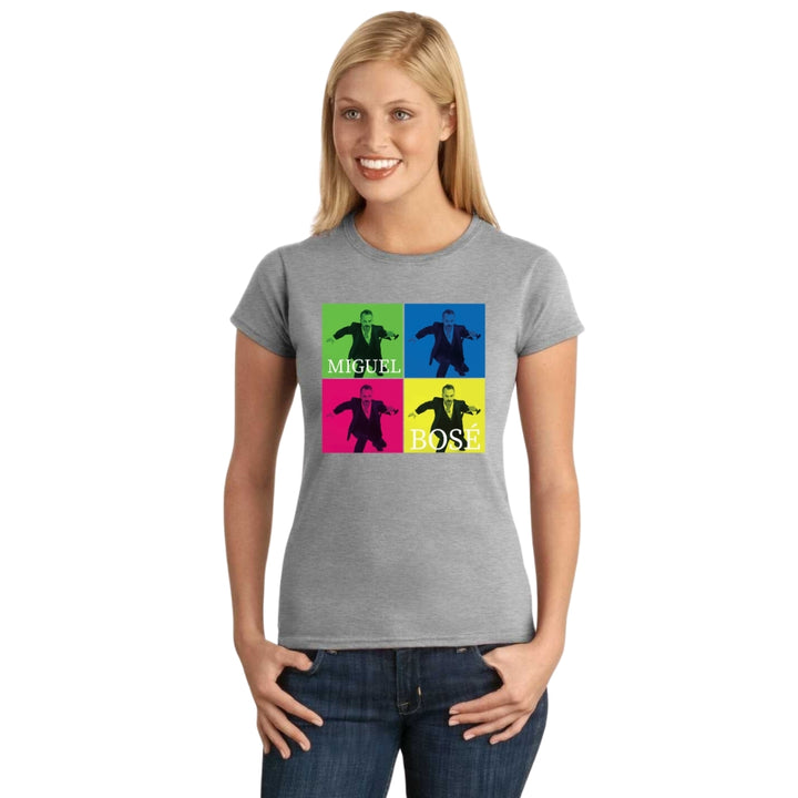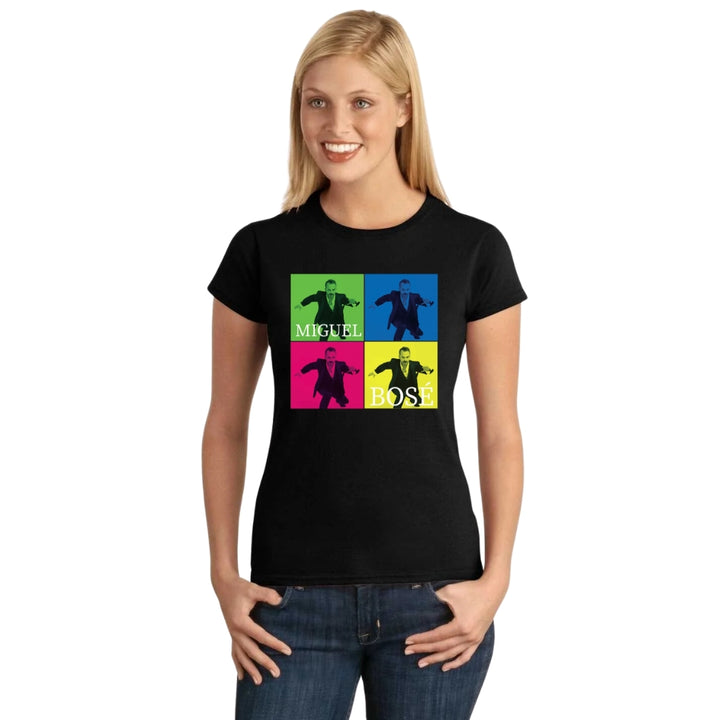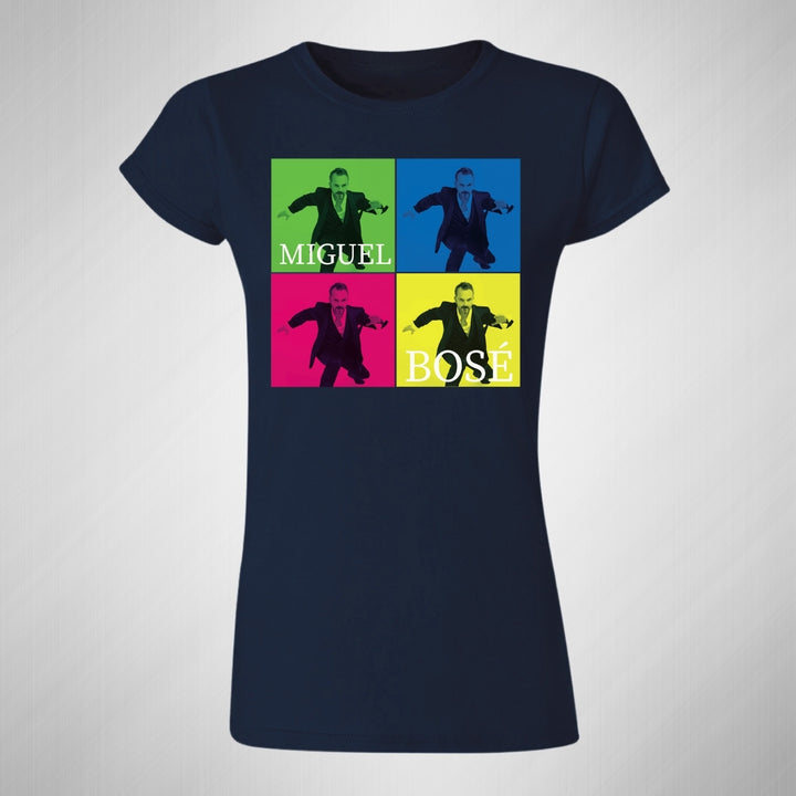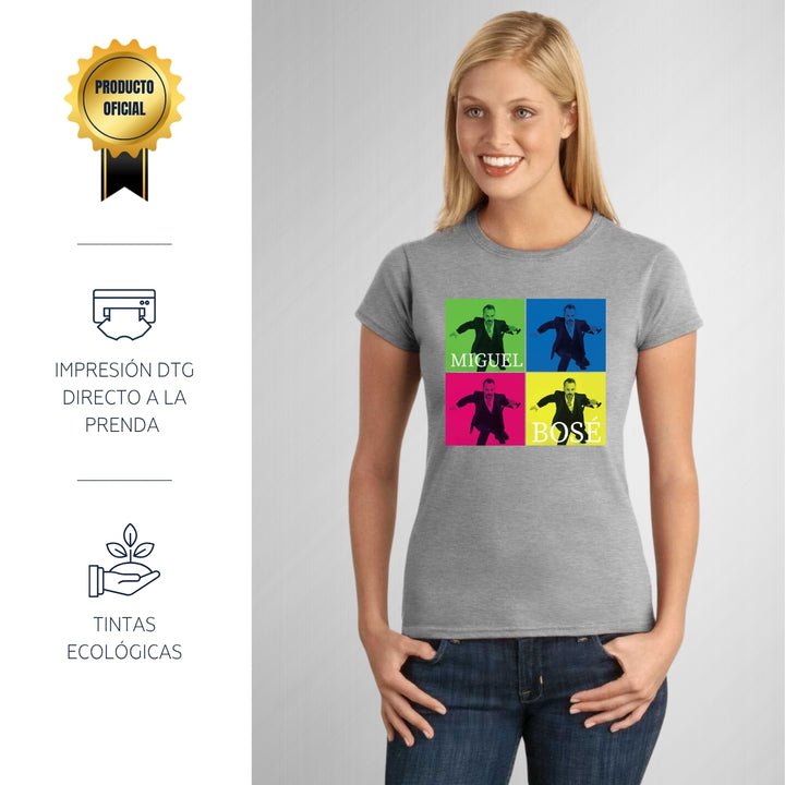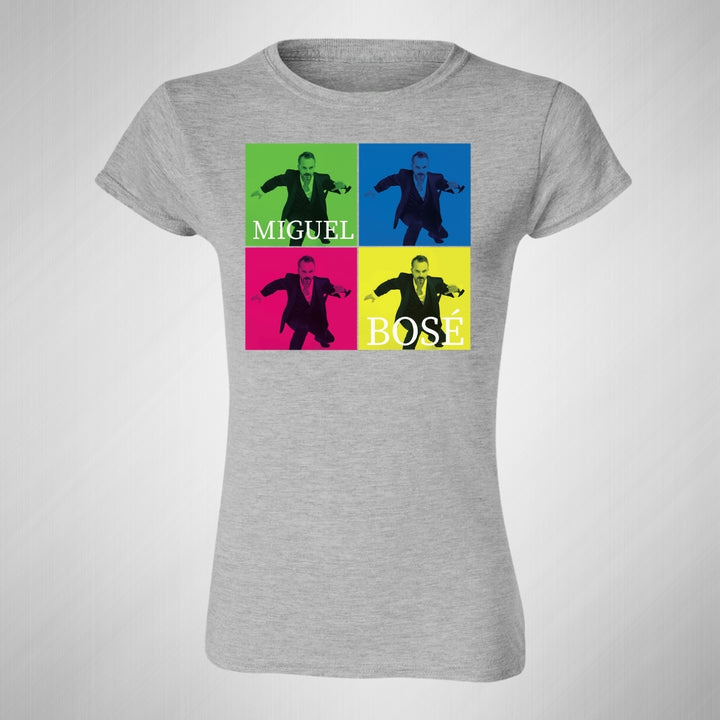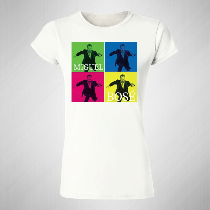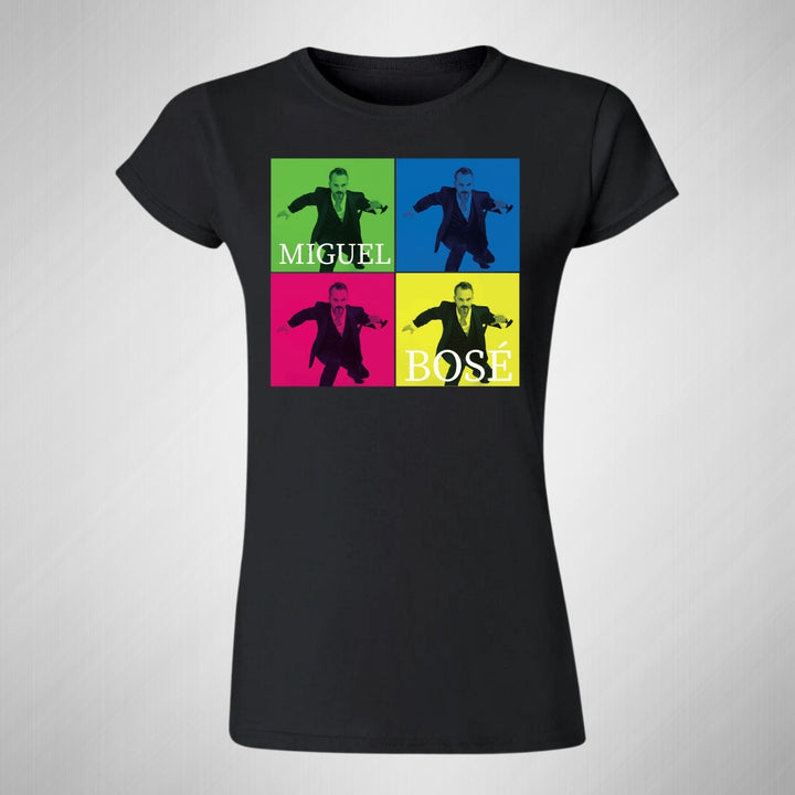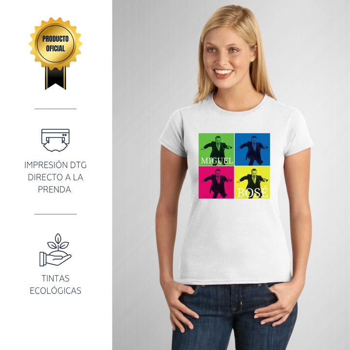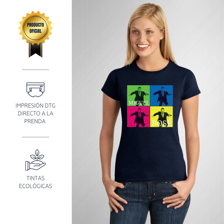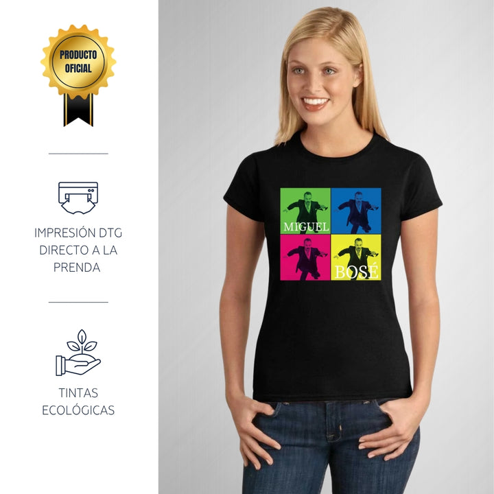 Playera de adulto manga corta, cuello redondo para mujer nueva, diseño Miguel Bosé Tour original impreso con tecnología DTG (directo a la prenda) tacto cero, uso casual o deportiva, 100% algodón peinado, ajuste semi entallado con costuras laterales. Colores de camiseta para dama: Negro, Blanco, Azul Marino, Gris.