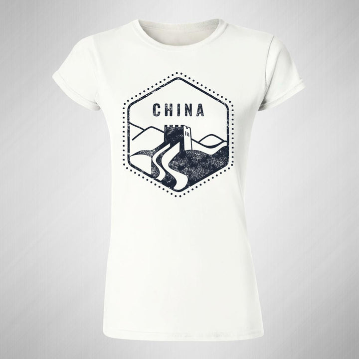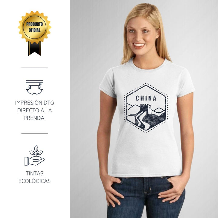 Playera de adulto manga corta, cuello redondo para mujer nueva, diseño País China original impreso con tecnología DTG (directo a la prenda) tacto cero, uso casual o deportiva, 100% algodón peinado, ajuste semi entallado con costuras laterales. Colores de camiseta para dama: Blanco.