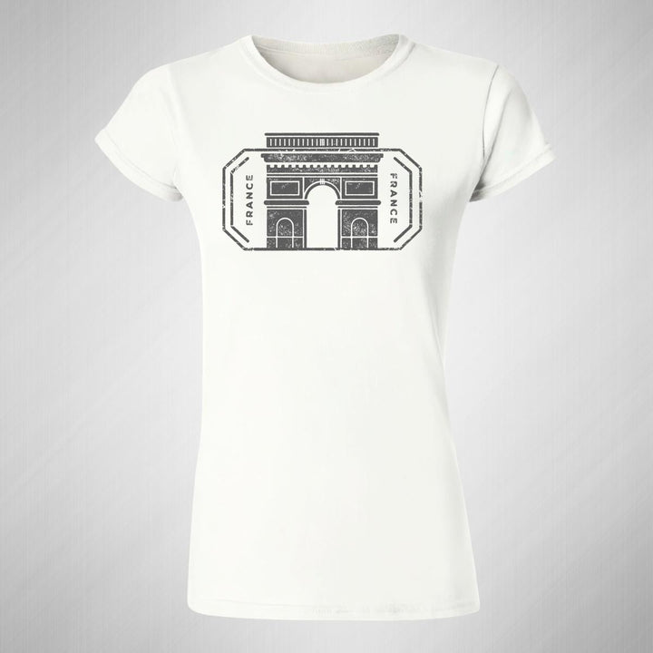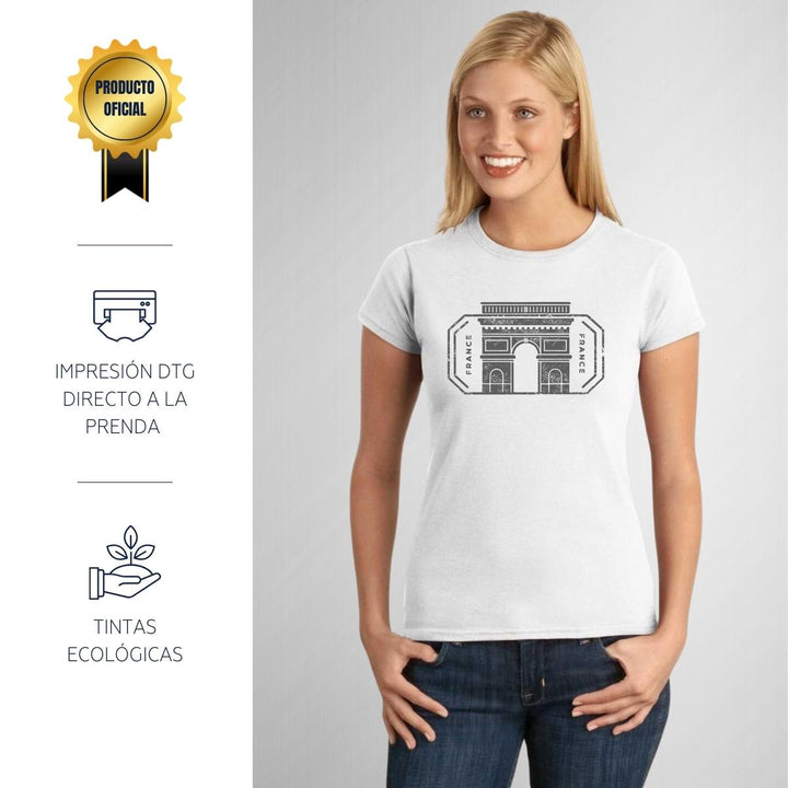 Playera de adulto manga corta, cuello redondo para mujer nueva, diseño País Francia original impreso con tecnología DTG (directo a la prenda) tacto cero, uso casual o deportiva, 100% algodón peinado, ajuste semi entallado con costuras laterales. Colores de camiseta para dama: Blanco.
