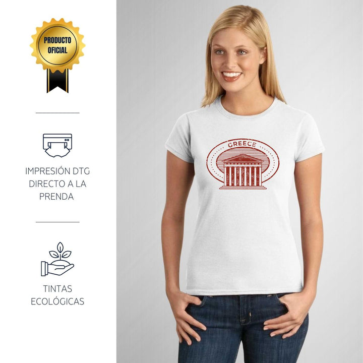 Playera de adulto manga corta, cuello redondo para mujer nueva, diseño País Grecia original impreso con tecnología DTG (directo a la prenda) tacto cero, uso casual o deportiva, 100% algodón peinado, ajuste semi entallado con costuras laterales. Colores de camiseta para dama: Blanco.