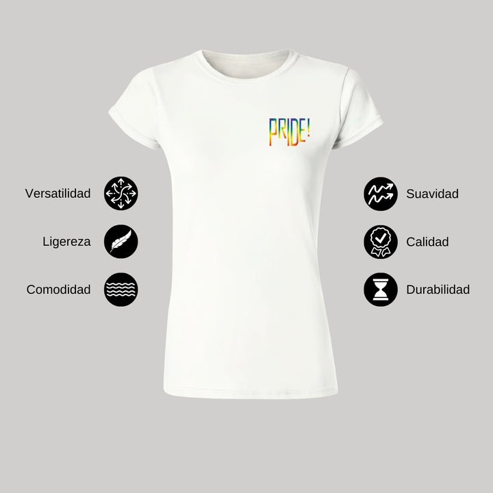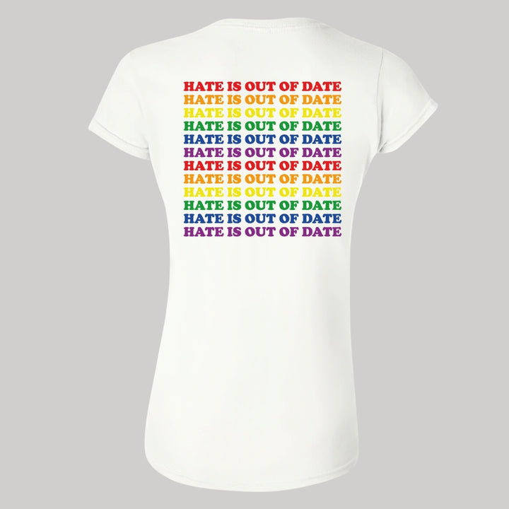 Playera de adulto manga corta, cuello redondo para mujer nueva, diseño Pride Hate is out of date original impreso con tecnología DTG (directo a la prenda) tacto cero, uso casual o deportiva, 100% algodón peinado, ajuste semi entallado con costuras laterales.