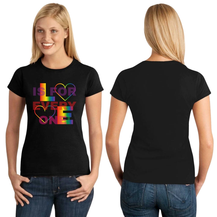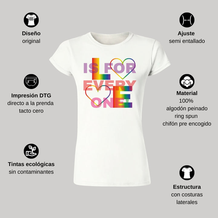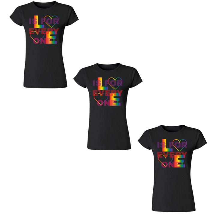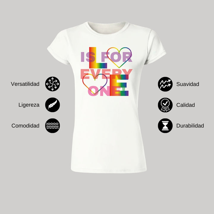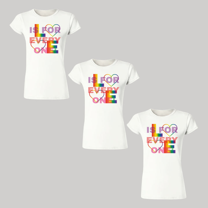 Paquete de 3 playeras de adulto manga corta, cuello redondo para mujer nueva, diseño Pride Love is for everyone original impreso con tecnología DTG (directo a la prenda) tacto cero, uso casual o deportiva, 100% algodón peinado, ajuste semi entallado con costuras laterales.