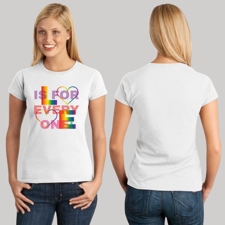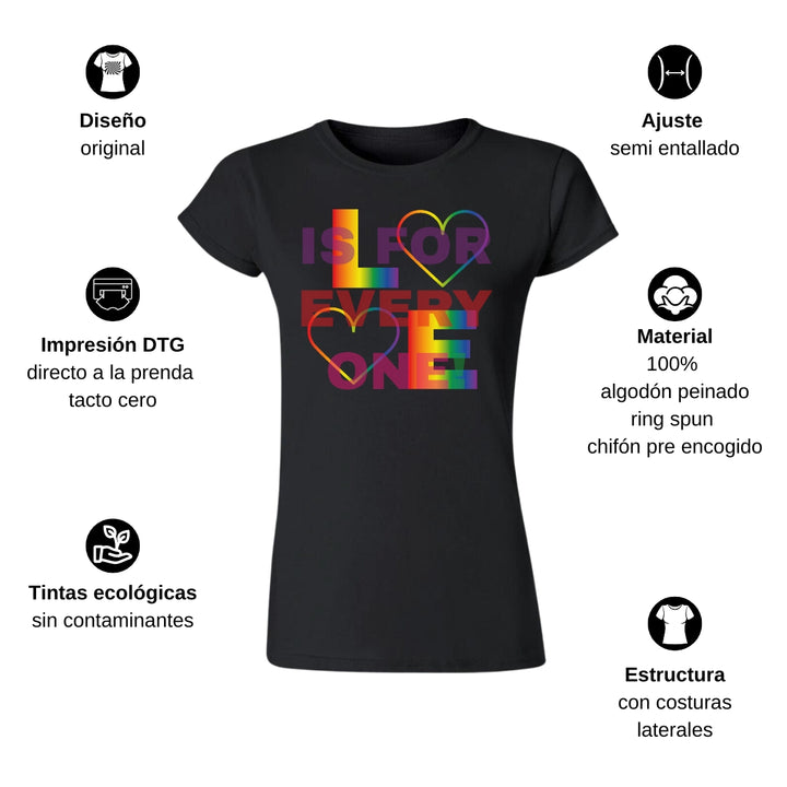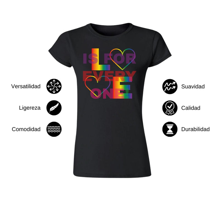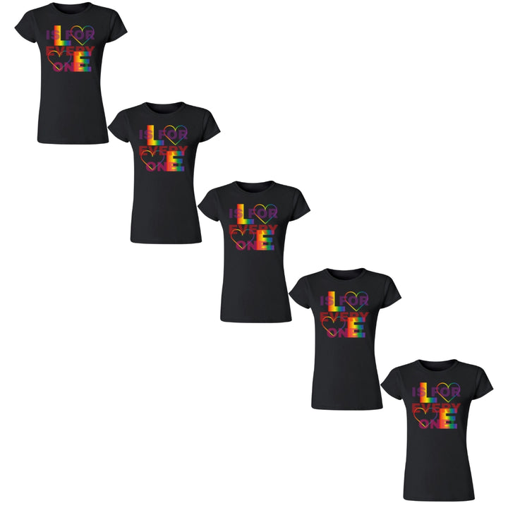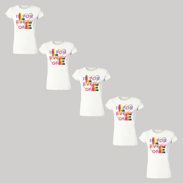 Paquete de 5 playeras de adulto manga corta, cuello redondo para mujer nueva, diseño Pride Love is for everyone original impreso con tecnología DTG (directo a la prenda) tacto cero, uso casual o deportiva, 100% algodón peinado, ajuste semi entallado con costuras laterales.