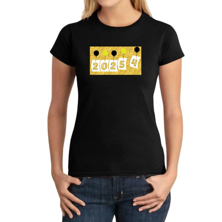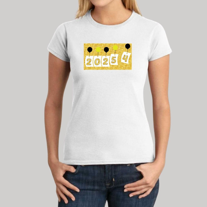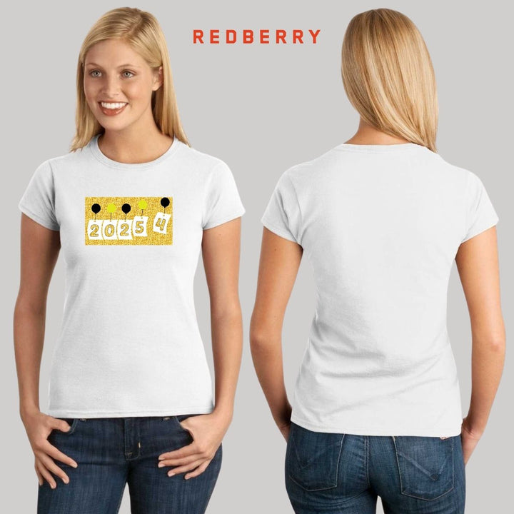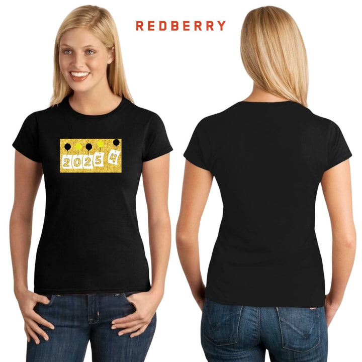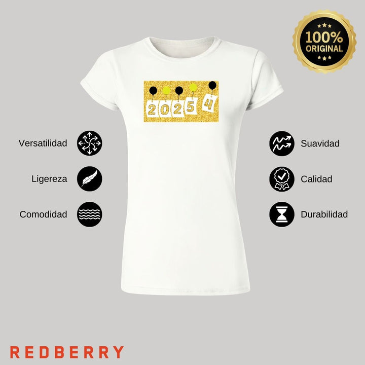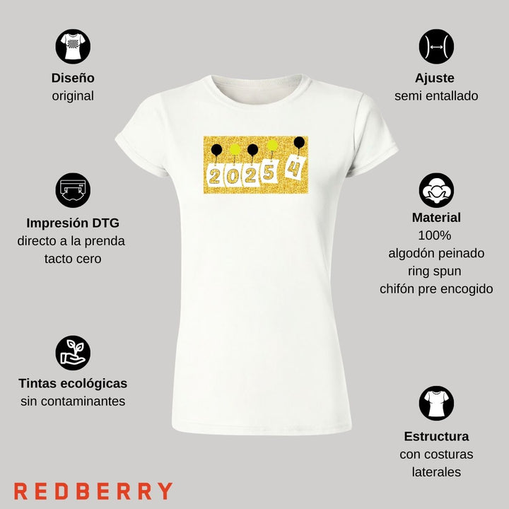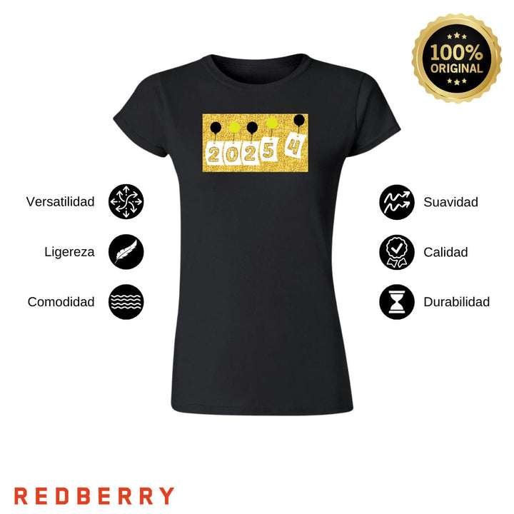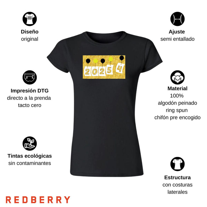 Playera de adulto manga corta, cuello redondo para mujer nueva Redberry oficial, diseño Año Nuevo Globos original, uso casual, 100% algodón peinado, ajuste semi entallado con costuras laterales. Colores de camiseta para dama: Negro y Blanco.