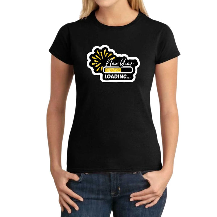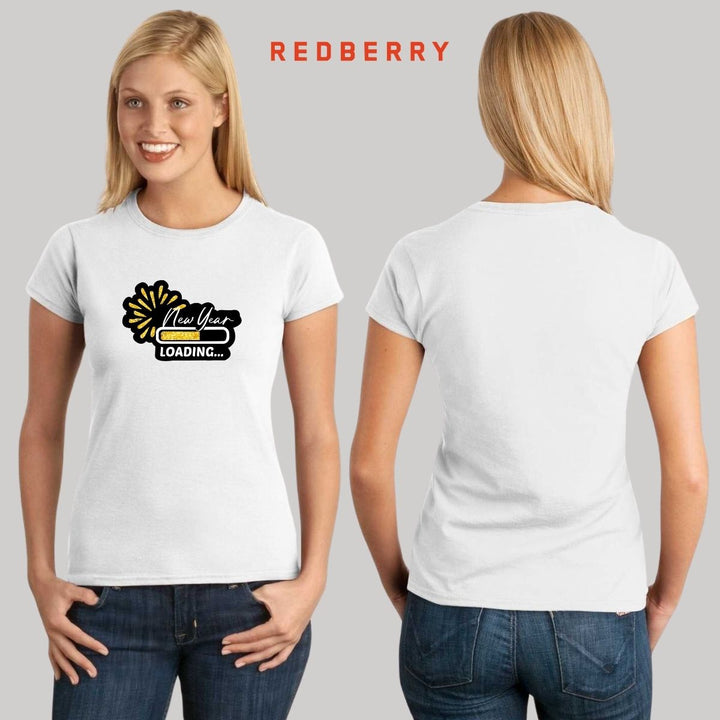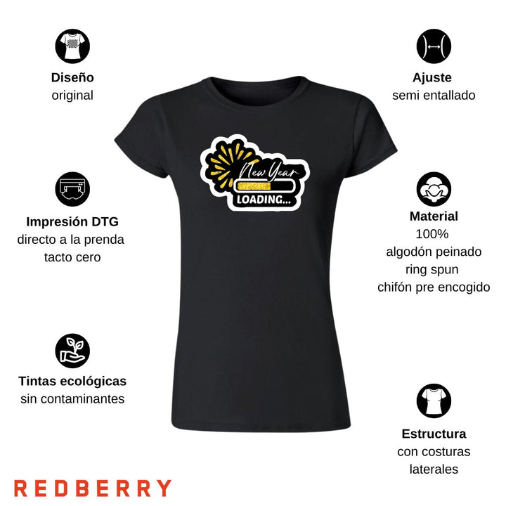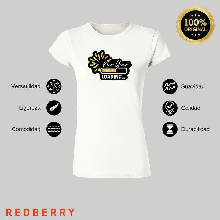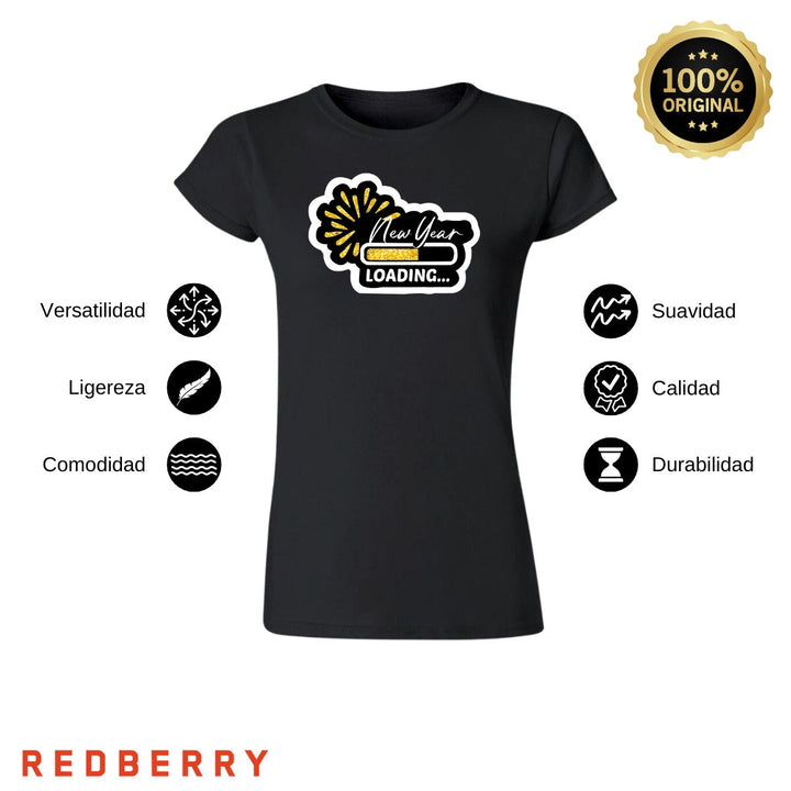 Playera de adulto manga corta, cuello redondo para mujer nueva Redberry oficial, diseño Cargando Año Nuevo original, uso casual, 100% algodón peinado, ajuste semi entallado con costuras laterales. Colores de camiseta para dama: Negro y Blanco.
