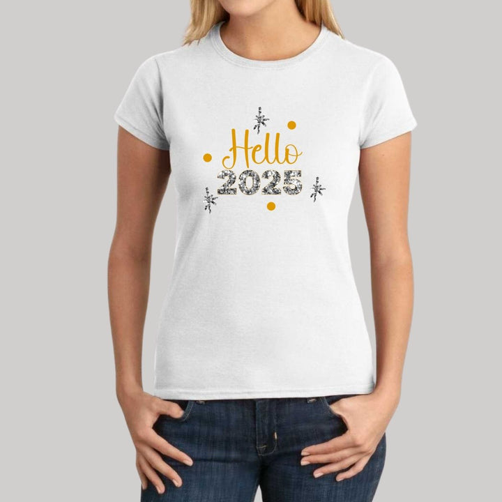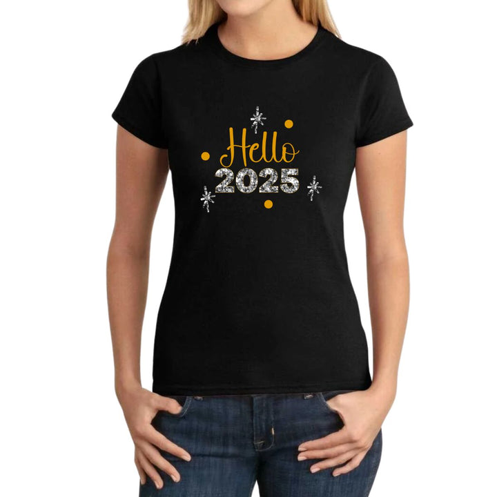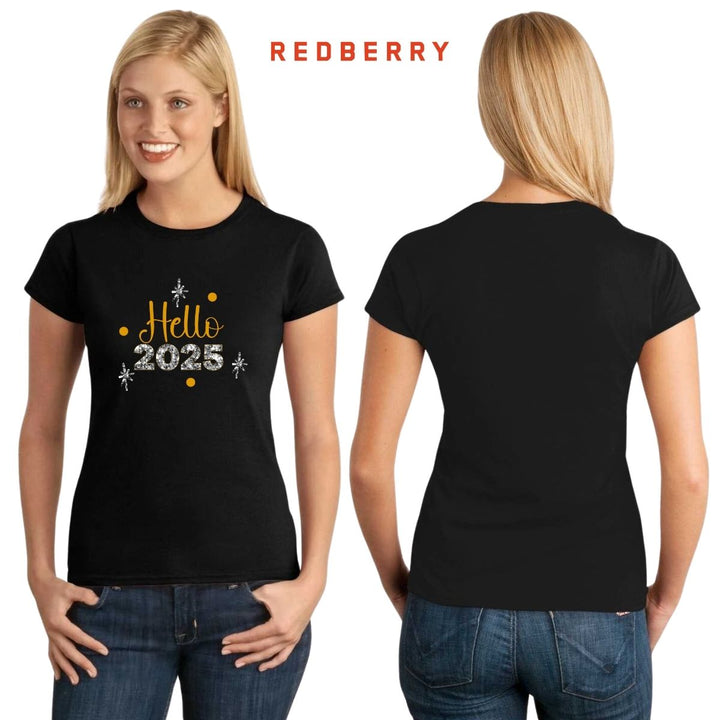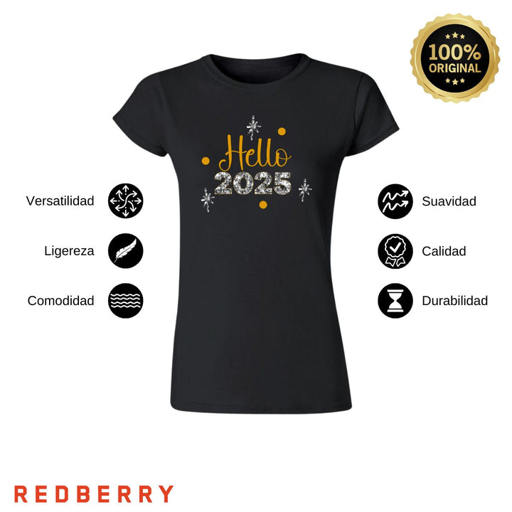 Playera de adulto manga corta, cuello redondo para mujer nueva Redberry oficial, diseño Hello New Year original, uso casual, 100% algodón peinado, ajuste semi entallado con costuras laterales. Colores de camiseta para dama: Negro y Blanco.