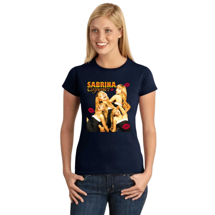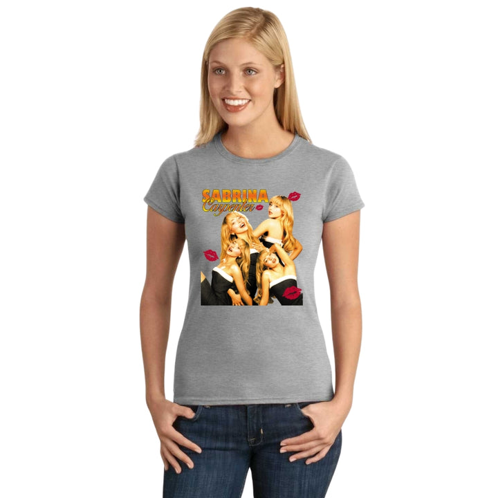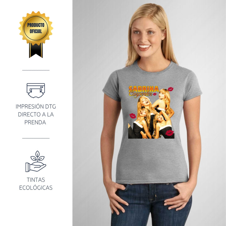 Playera de adulto manga corta, cuello redondo para mujer nueva, diseño Sabrina CaSHenter original impreso con tecnología DTG (directo a la prenda) tacto cero, uso casual o deportiva, 100% algodón peinado, ajuste semi entallado con costuras laterales. Colores de camiseta para dama: Negro, Blanco, Azul Marino, Gris.