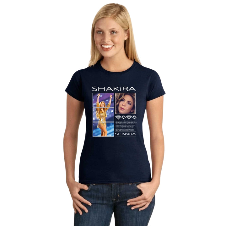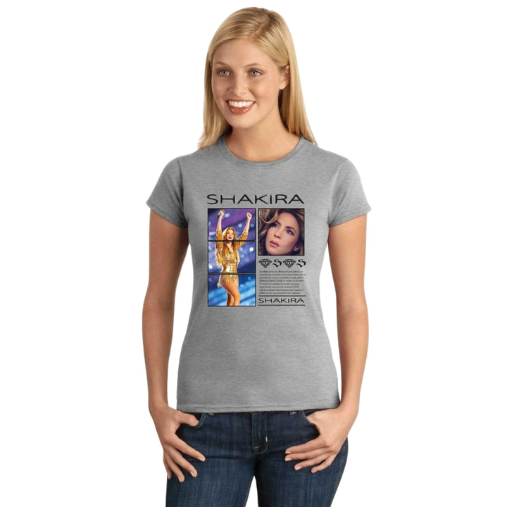 Playera de adulto manga corta, cuello redondo para mujer nueva, diseño Shakira Reyna del Pop Latino original impreso con tecnología DTG (directo a la prenda) tacto cero, uso casual o deportiva, 100% algodón peinado, ajuste semi entallado con costuras laterales. Colores de camiseta para dama: Blanco, Negro, Azul Marino, Gris.
