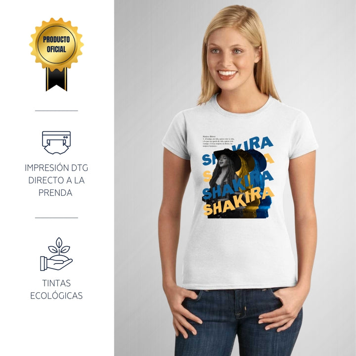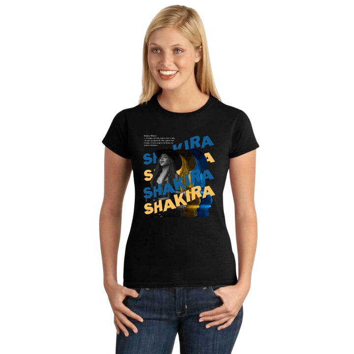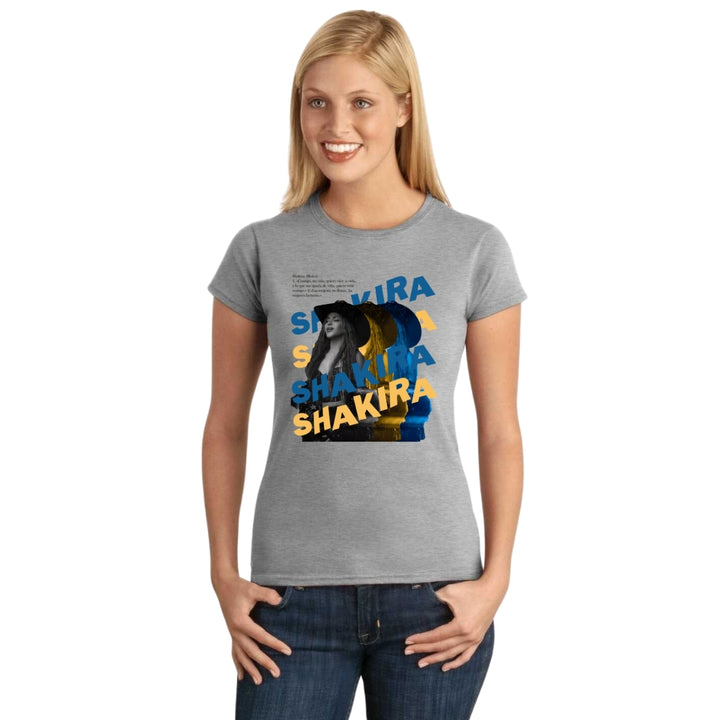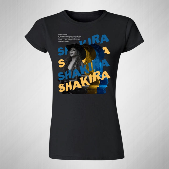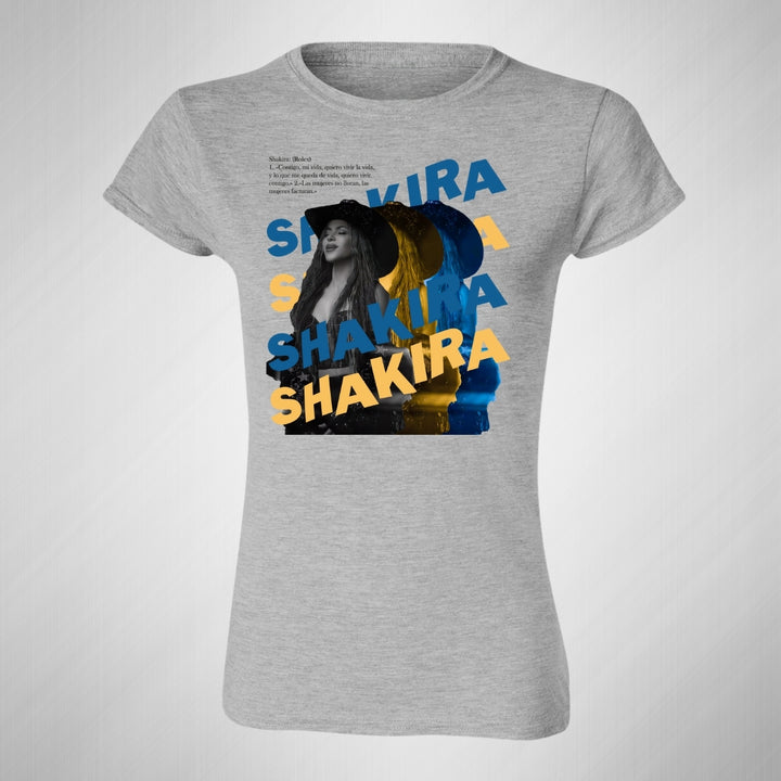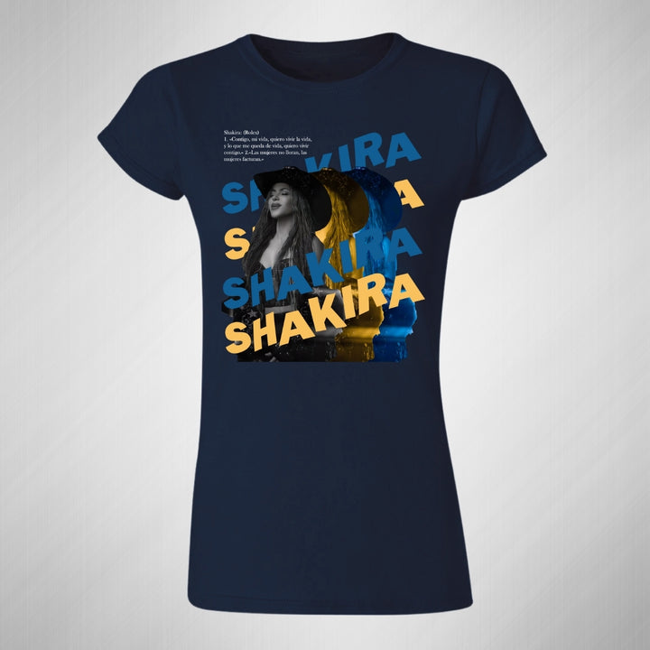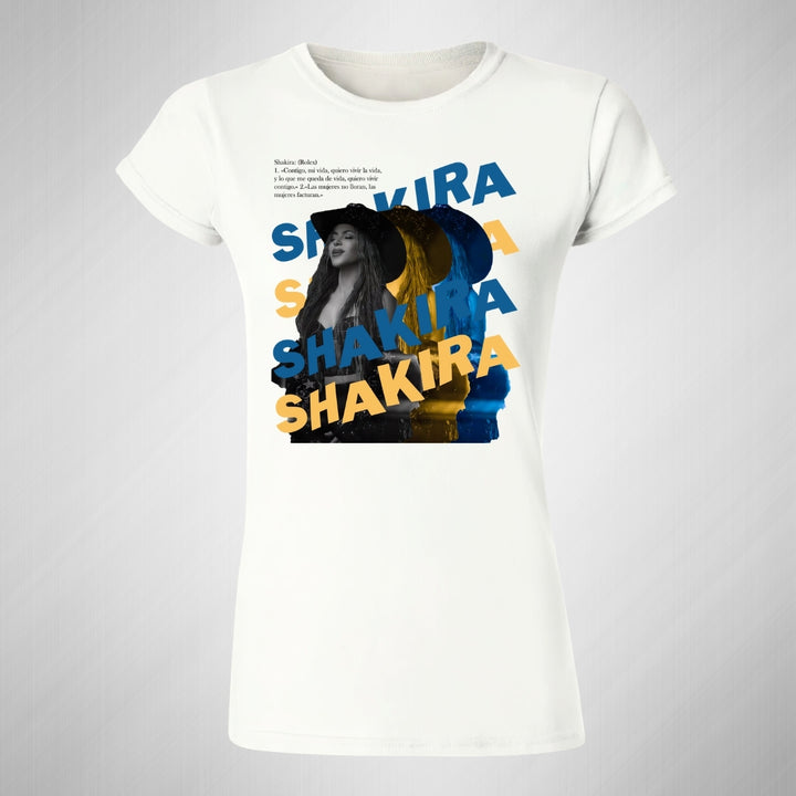 Playera de adulto manga corta, cuello redondo para mujer nueva, diseño Shakira Rolex original impreso con tecnología DTG (directo a la prenda) tacto cero, uso casual o deportiva, 100% algodón peinado, ajuste semi entallado con costuras laterales. Colores de camiseta para dama: Blanco, Negro, Azul Marino, Gris.