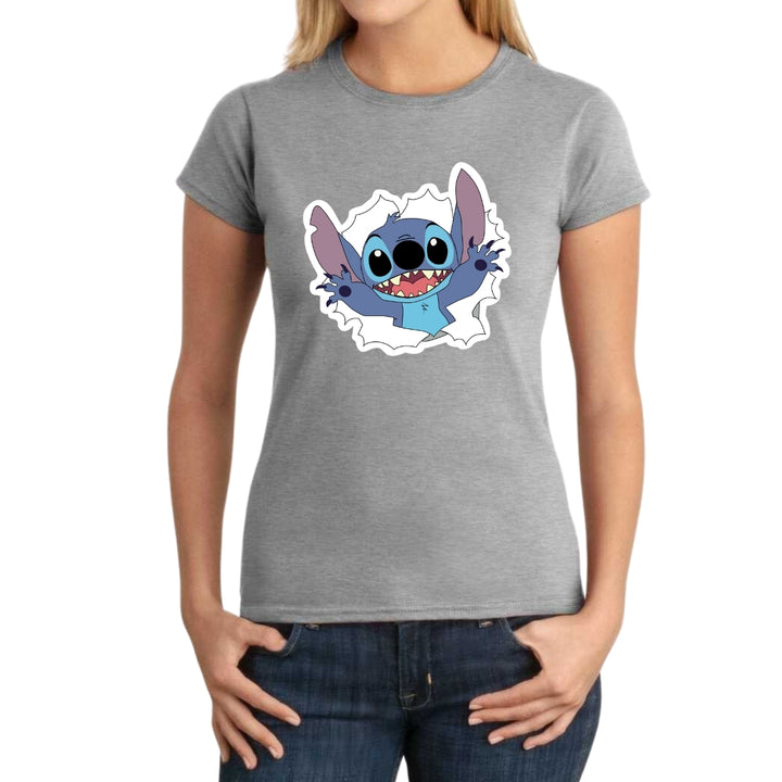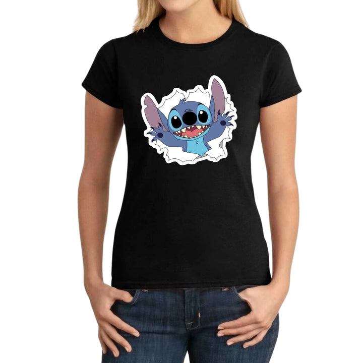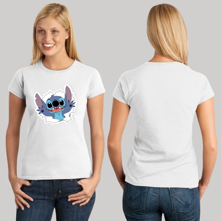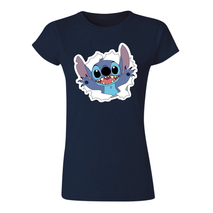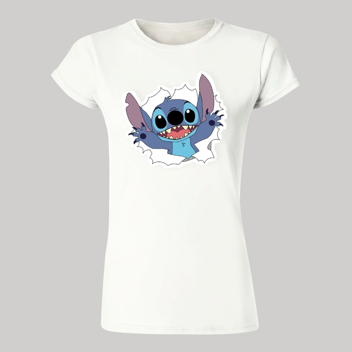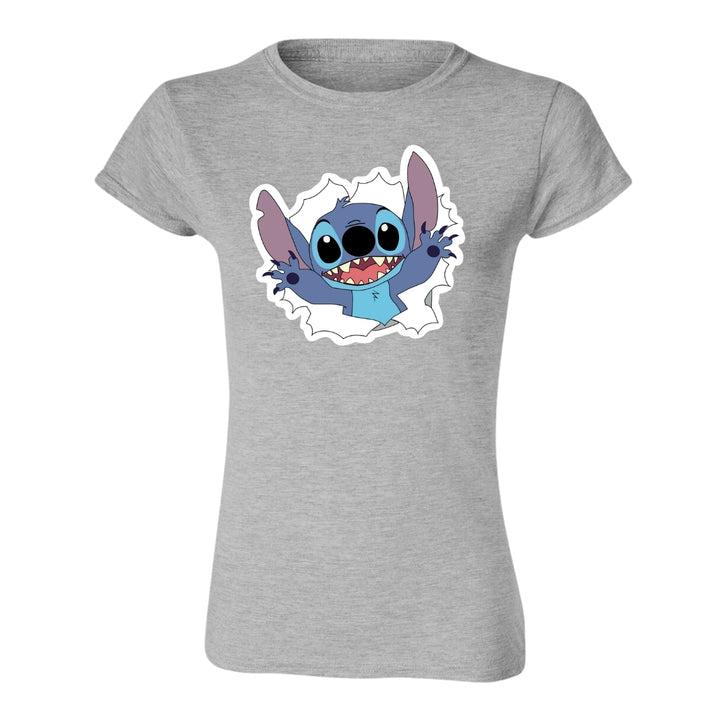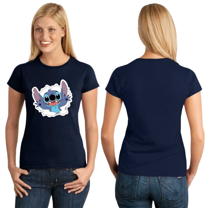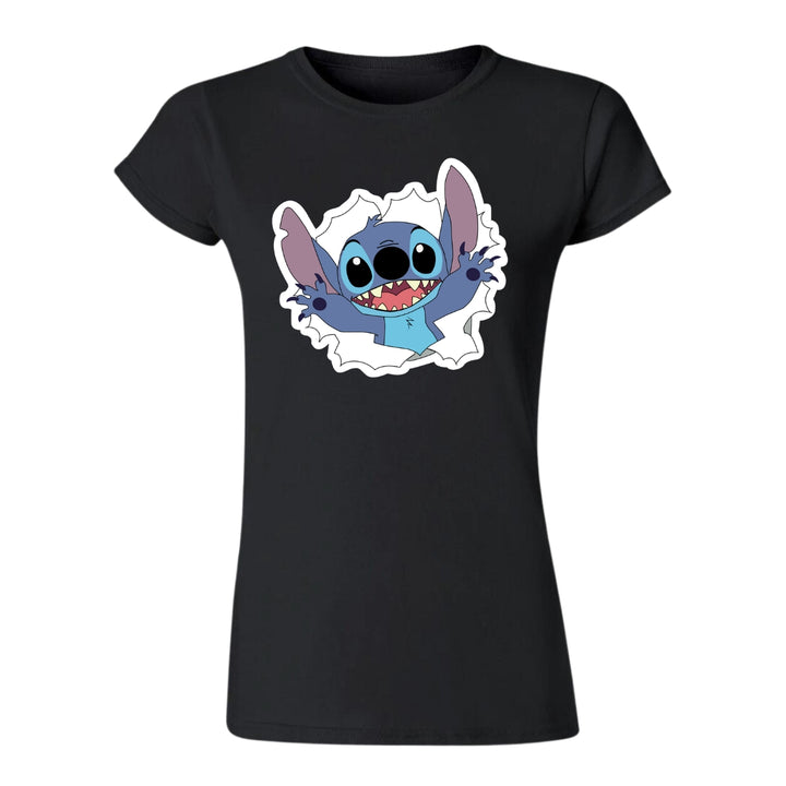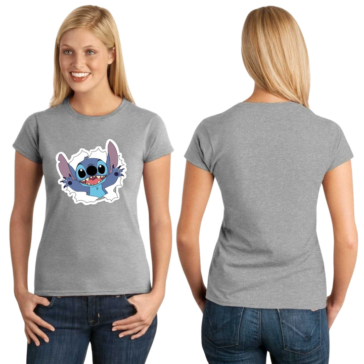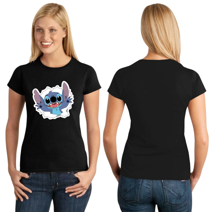 Playera de adulto manga corta, cuello redondo para mujer nueva, diseño Stitch original impreso con tecnología DTG (directo a la prenda) tacto cero, uso casual o deportiva, 100% algodón peinado, ajuste semi entallado con costuras laterales. Colores de camiseta para dama: Azul Marino, Blanco, Negro, Gris.