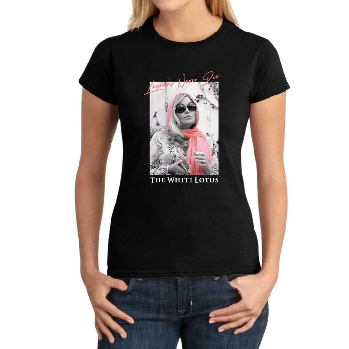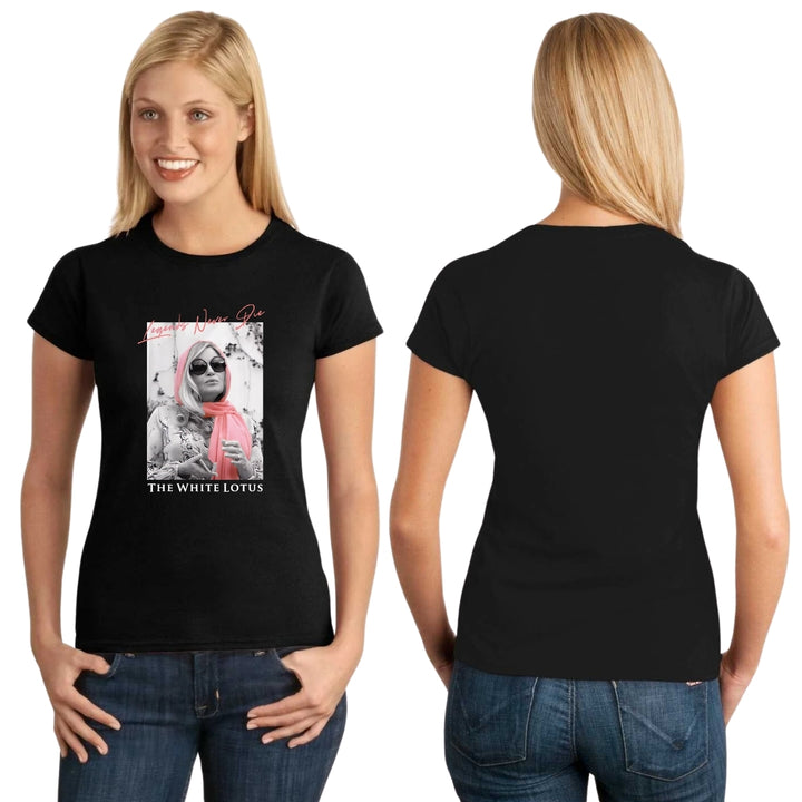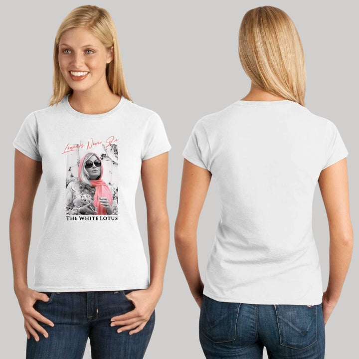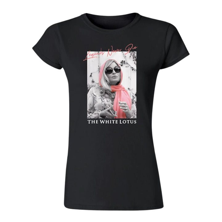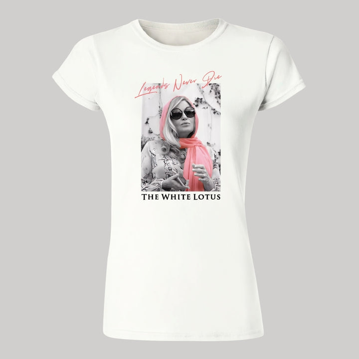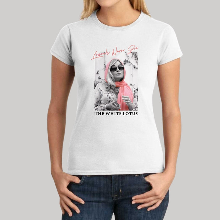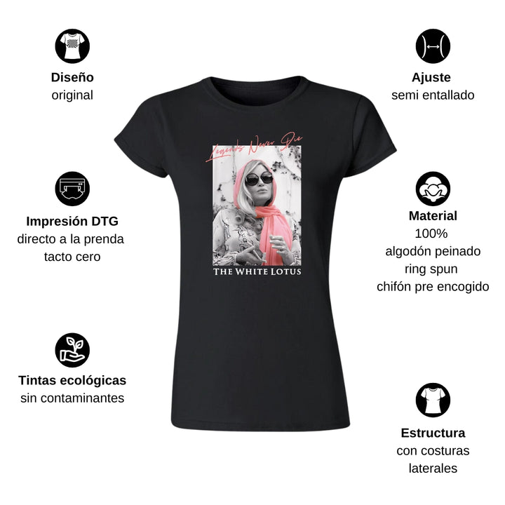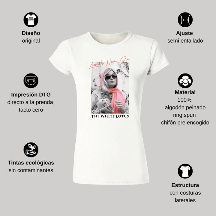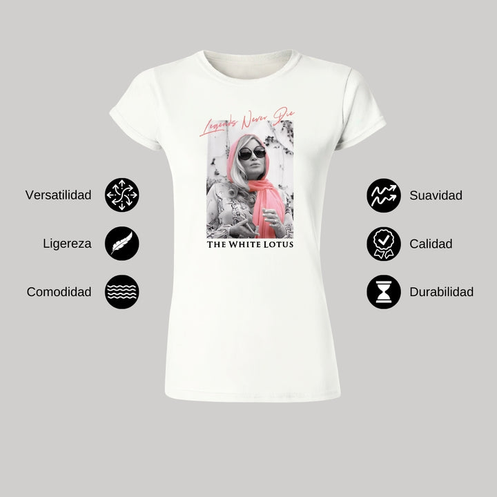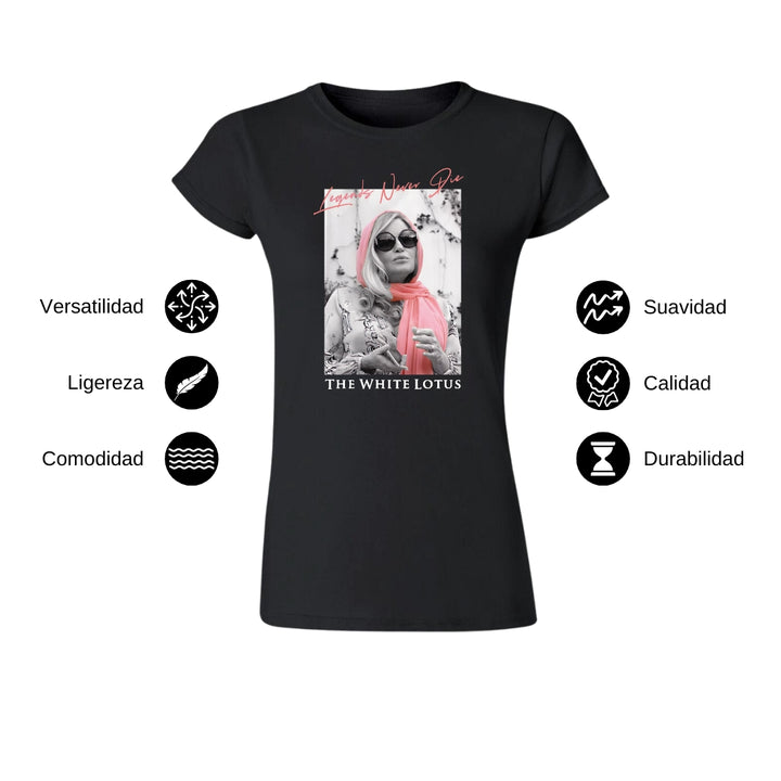Playera de adulto manga corta, cuello redondo para mujer nueva, diseño The White Lotus Leyends Never Die original impreso con tecnología DTG (directo a la prenda) tacto cero, uso casual o deportiva, 100% algodón peinado, ajuste semi entallado con costuras laterales.