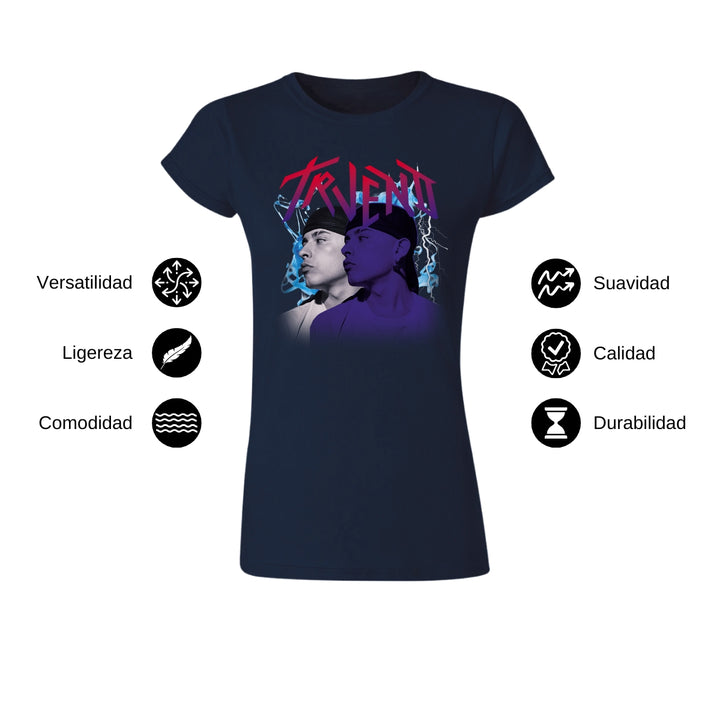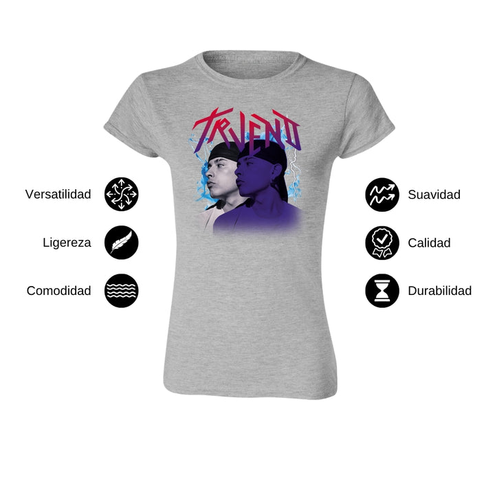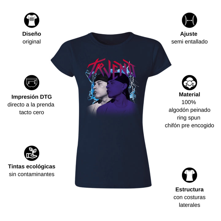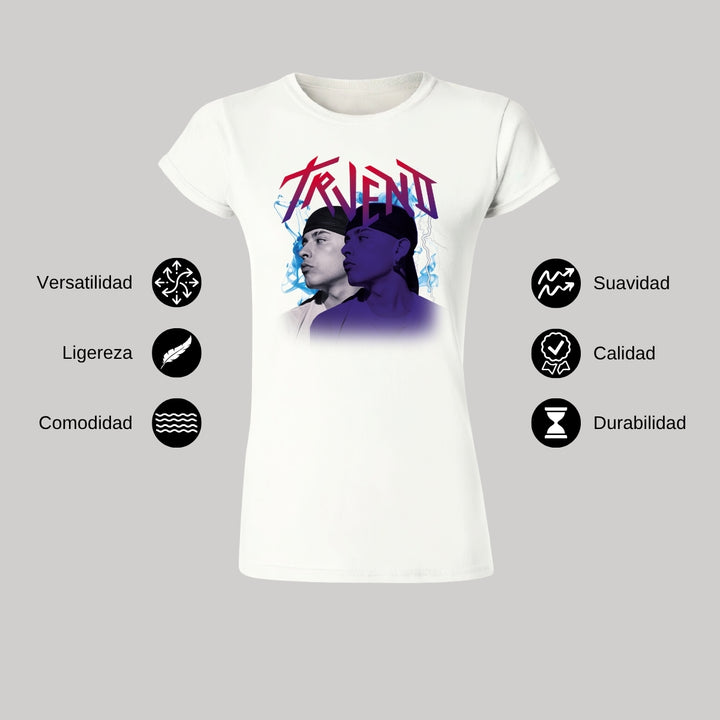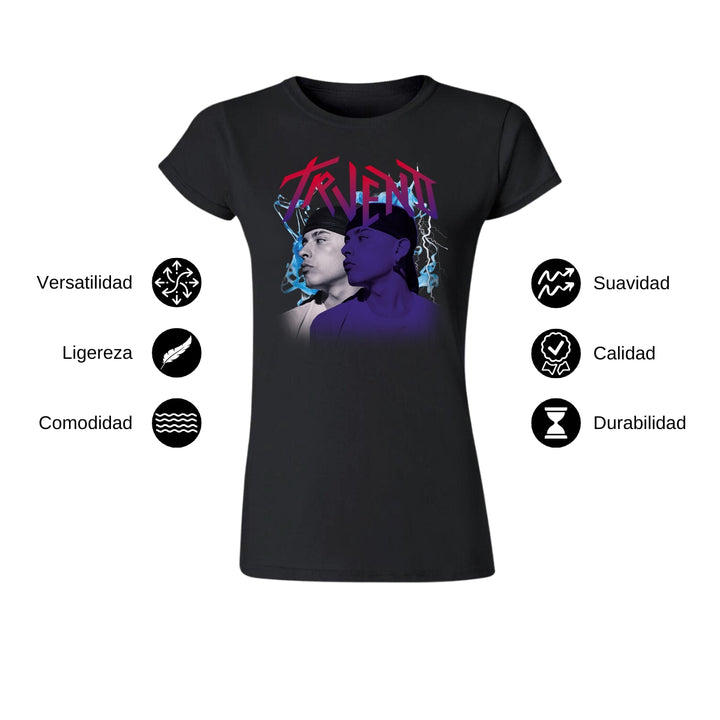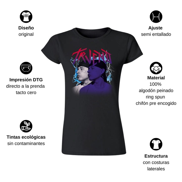 Playera de adulto manga corta, cuello redondo para mujer nueva, diseño Trueno Rapero Rap original impreso con tecnología DTG (directo a la prenda) tacto cero, uso casual o deportiva, 100% algodón peinado, ajuste semi entallado con costuras laterales. Colores de camiseta para dama: Negro, Blanco, Azul Marino, Gris.
