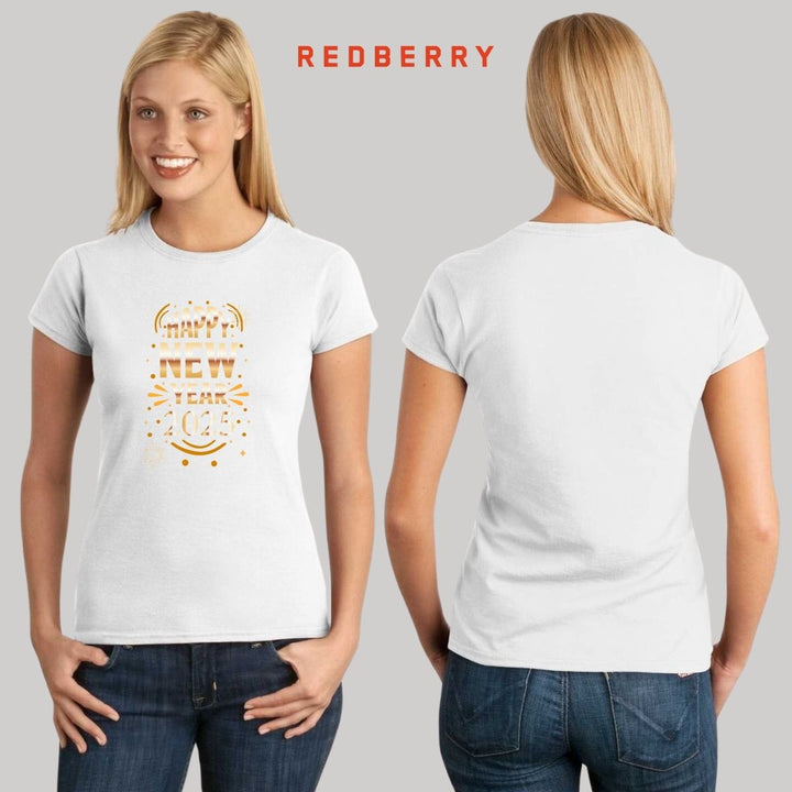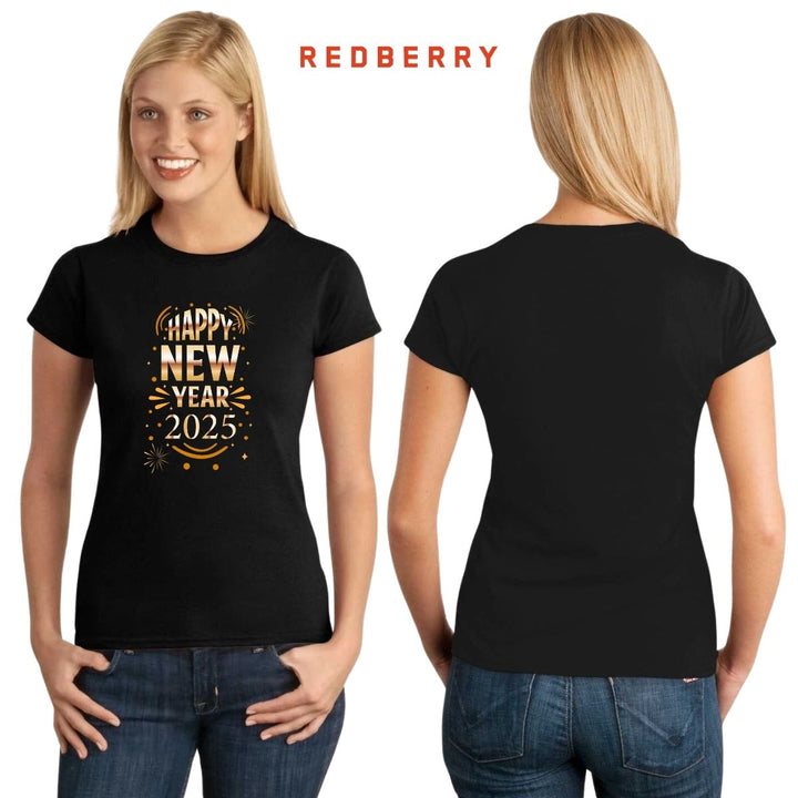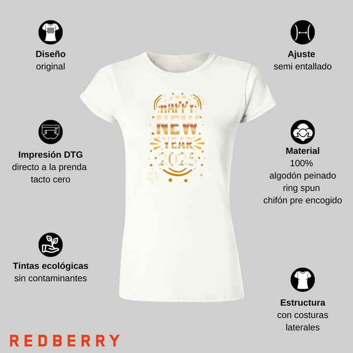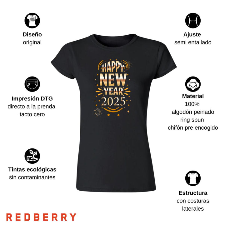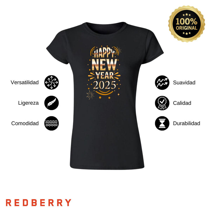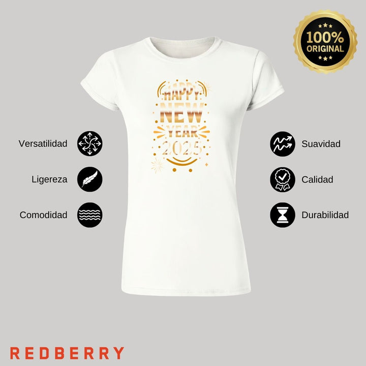 Playera de adulto manga corta, cuello redondo para mujer nueva Redberry oficial, diseño Happy New Year original, uso casual, 100% algodón peinado, ajuste semi entallado con costuras laterales. Colores de camiseta para dama: Negro y Blanco.